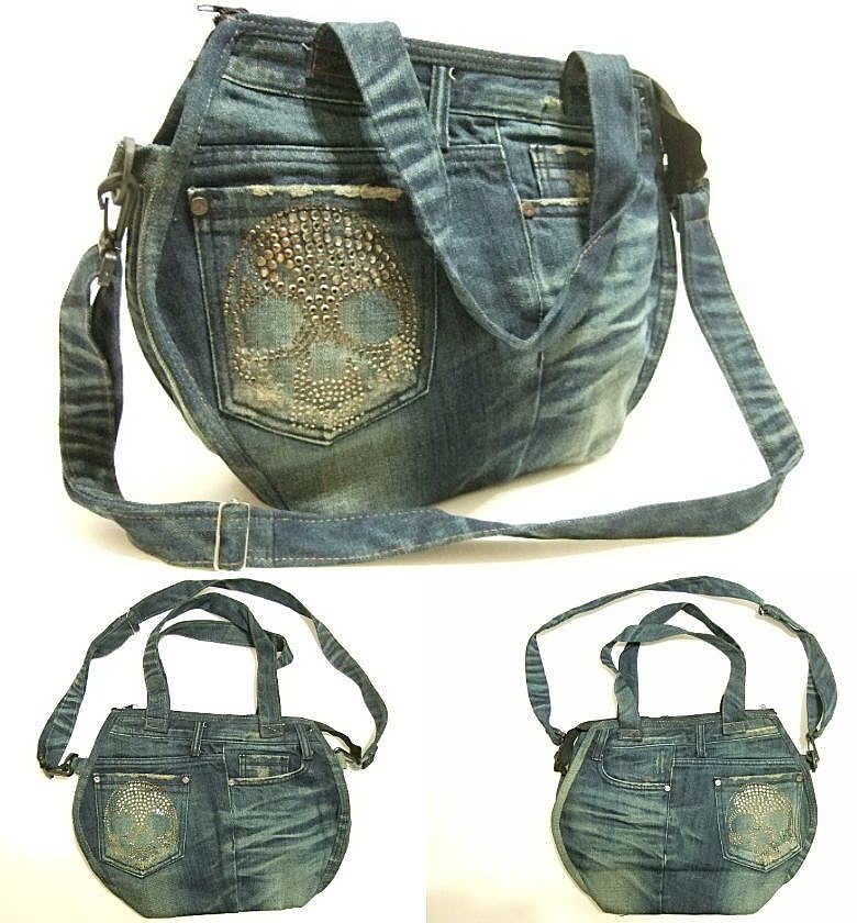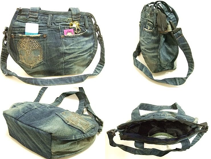 | 商品名 | 横浜最新 魅惑のデニム ショルダー&手提げツーウェイダメージバッグ♪ラインストーンドクロ柄 巾38cm 縦29cm マチ10.5cm底板付 |