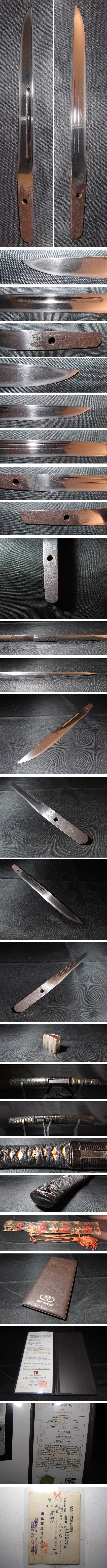 種類:短刀 銘:国俊 登録:東京111677 鑑定書:あり(倉敷刀剣美術館) 刃長18.6㎝ 全長27.3㎝ 元幅1.6㎝ 元重0.6㎝ 先幅2.1㎝ 先重0.75㎝ 外装全長32.6㎝ ※中古品・時代物であることをご理解頂き、十分写真にてご検討の上ご入札下さい。 ◎発送は宅急便元払いを利用させて頂きます。 ◎運送中の破損が無いよう十分気を付けて梱包させていただきます。 ◎送料は大きさ・個数に関わらず、全国一律1,000円になります。 ◎次の地域は送料が変わります。 北海道1,500円・沖縄・離島2,000~3,000円 ◎複数個ご落札頂きましても、1個分の送料で結構です。 ◎小さな品物や割れ物以外の物は、定形外等の発送方法が可能です。お気軽にお問い合わせくださいませ。 ◎15時までにご入金を確認させて頂いたものについては、即日発送させて頂きます。15時以降のご入金分は翌日の発送になります。 ◎日・祝日の業務はお休みを頂いております。 | |||