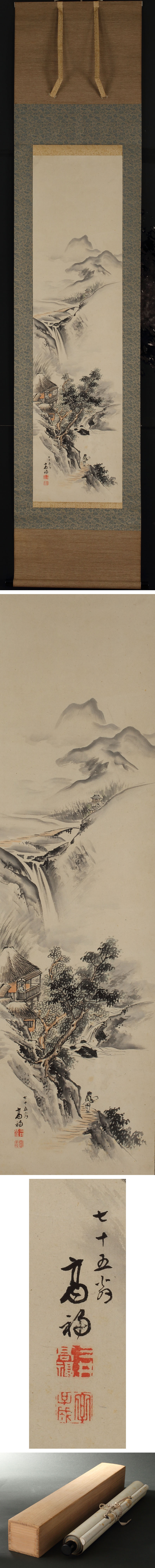 三井高福の山水画です。 琴を抱えた童子が山中の隠者を訪ねる様を画いております。明治15(1882)年、75歳の作です。 三井惣領家の当主として維新期の難局に立ち向かいながら、隠逸の境地に思いを馳せた一文人の姿が思い浮かぶ逸品です。 某数寄者研究者の旧蔵品です。 ◆三井高福 江戸後期-明治期の実業家。三井総領家8代。天保8(1837)年13代八郎右衛門を襲名。同族を統率し,幕末の経営不振と維新の政局に対処。王政復古に際していち早く朝廷方に献金し,新政府の政商となる。明治9(1876)年三井銀行・三井物産を創業,三井財閥の基礎をきずいた。明治18(1885)年没、78歳。京都出身。 付属:桐箱が付属します。 寸法:高さ198cm、幅43cm(最大幅。若干の誤差はご了承下さい) 状態:経年のシミ・イタミがございます。 |