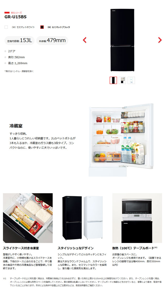 東芝 2ドア冷蔵庫 GR-U15BS(K) を出品いたします。 ■特徴■ 冷蔵室 すっきり収納。 1人暮らしにうれしい収納量です。 2Lのペットボトルが3本も入るほか、 冷蔵室のガラス棚も3段タイプ。 コンパクトなのに、使いやすい工夫でいっぱいです。 スライドケース付き冷凍室 整理がしやすく使いやすい。 冷凍室内に、小物類を置けるスライドケースを搭載。 下段のケースと合わせることで、 作り置きの食品や大物の冷凍食品など 整理整頓して収納できます。 スタイリッシュなデザイン シンプルなデザインでどんなキッチンにもフィット。 扉は大きなラウンドフォルムで、 スタイリッシュな印象に。 また、セミマットなカラーを採用し、 落ち着いた雰囲気を演出します。 耐熱(100℃)テーブルボード お部屋の省スペースに。 オーブンレンジも使用できます。 (設置できるレンジの脚間寸法は幅400mm、奥行350mm以内) ■仕様■
