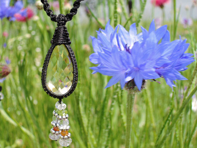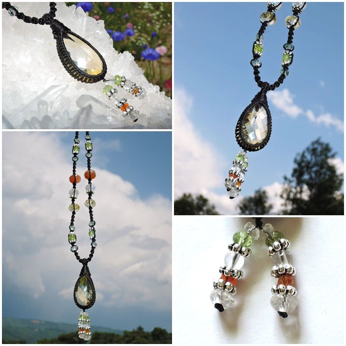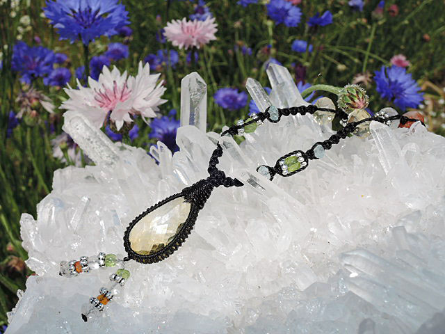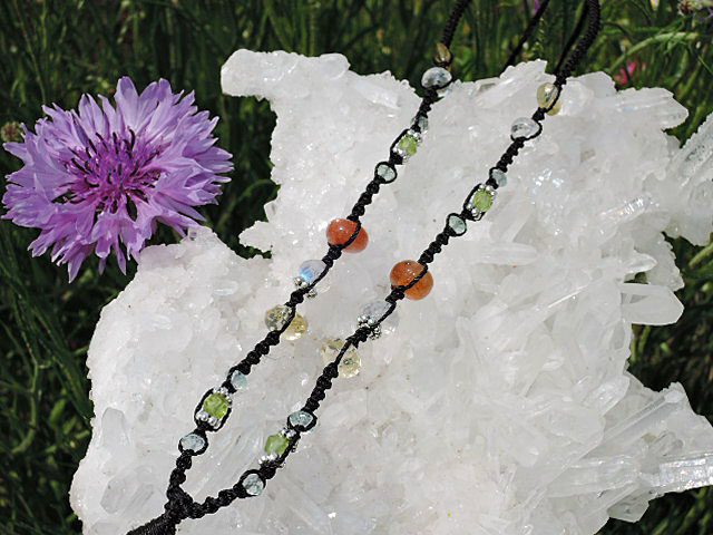 一緒に編みこんである石は下から 【 アクアマリン・カット、シルバー、ペリドット、アクアマリン・カット、シトリン・カット、シルバー、ロイヤルレインボーームーン・カット、レインボーサンストーン、アクアマリン・カット、シルバー、ペリドット・カット、アクアマリン・カット、クリスタル・カット、シトリン・カット 】