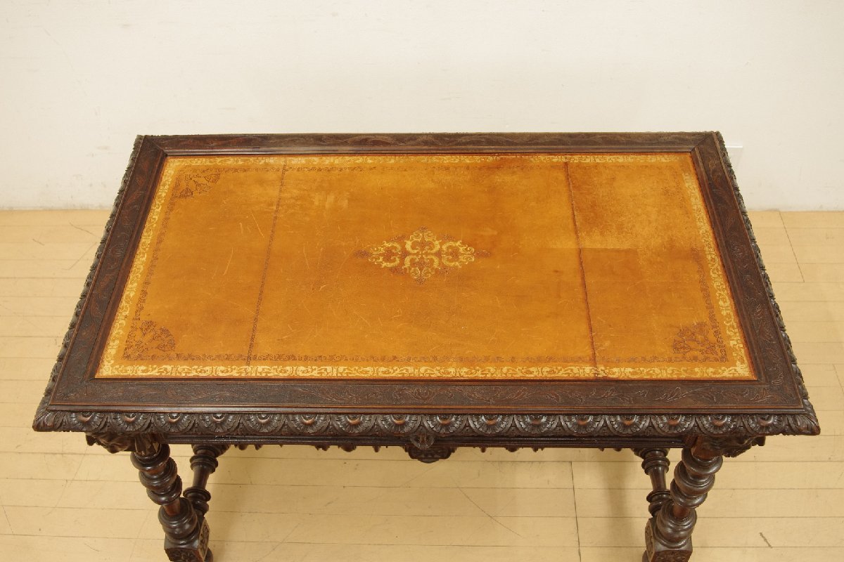 | ■商品詳細■ アンティーク コンソールテーブルのご紹介です。 ご紹介するテーブルは、精巧な彫刻が、綿密に施された豪華なテーブル。 置いているだけで、見る人の目を惹き、空間を豪華にエレガントに演出してくれる逸品です。 各コーナーに施されたデビルの面は、ヨーロッパにおける魔除けなどの何かしらの深き意味があるのではないのでしょうか。 また、トップ机部分は革張り。革に施された文様と、装飾彫刻が、品の良いヨーロピアンアンティークの雰囲気を醸し出します。 テーブルトップの下にある2杯の引き出しは、ちょっとした小物を収納し、すっきりと整えてくれ実用性も兼ね備えております。 尚、小ぶりなサイズとなりますので、ワークデスクとして、また、飾り台としてなど、多様な用途でお使いいただけます。 ご自宅のリビング家具として、また待合やロビー、店舗什器としてなど、ワンランク上の、贅沢な空間づくりにお役立てください。 希少なお品となりますので、是非この機会に、ご検討くださいませ。 【コンディション】 ■使用品■ ・革面には、スレ傷、線傷などがございます。 ・引出し内には経年に伴う、染み汚れが生じております。 ・そのほか、木部には、打ち傷、彫刻面にライン上に割れが生じている箇所がございます。古いお品となりますので、若干のぐらつきはございますが、通常に使用における支障はございません。予めご了承ください。 ・全体的に美観を損ねるようなダメージは見られませんので、雰囲気よくご利用いただけるコンディションとなります。 ※清掃、撮影時に目立つ箇所を抜粋して写真掲載しておりますが、同等の傷などがあるものとご了承ください。尚、商品ページの追加写真にて状態をご確認の上、ご検討いただけますよう、お願いいたします。 この他にも商品を多数出品しておりますので、こちらから御覧下さい。 | ||