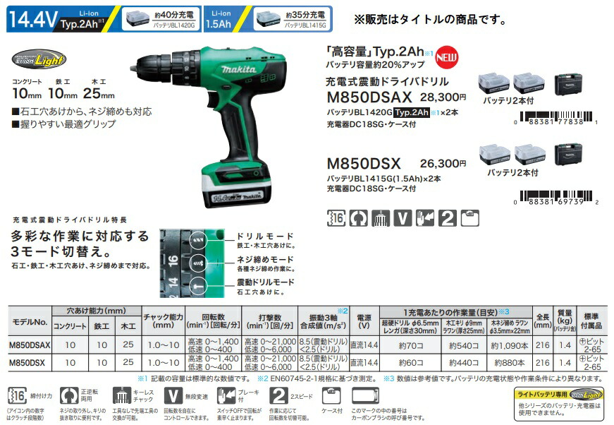 マキタ makita充電式震動ドライバドリル キーレスチャック仕様 M850DSAXバッテリBL1420G+充電器DC18SG+ケース付多彩な作業に対応する3モード切替え。石工・鉄工・木工穴あけ、ネジ締めまで対応。・ドリルモード…鉄工・木工穴あけ。・ネジ締めモード…ネジ締めまで作業に。・震動ドリルモード…石工穴あけに。88381778381
