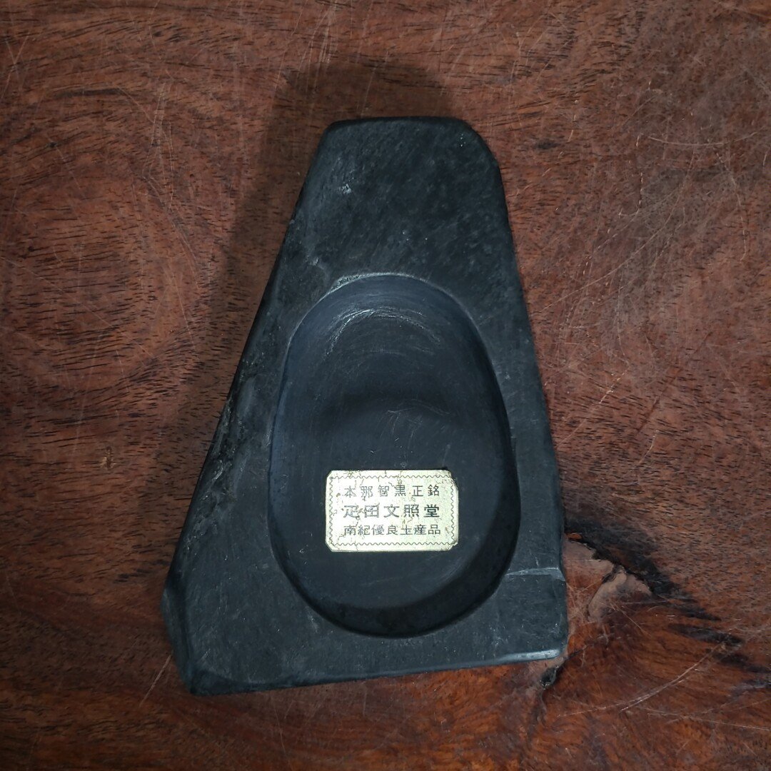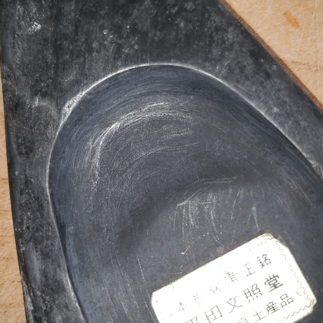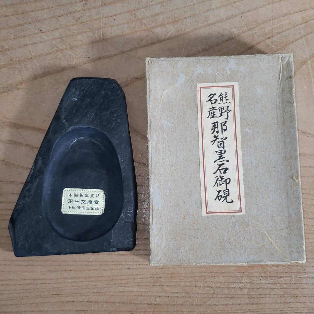 那智黒石の硯です。経年による汚れ、擦れがあります。底面に記念品の刻印があります。人名は消してあります。墨を入れる部分に鉛筆で描いたような跡があります。紙箱は汚れやシミが多いです。