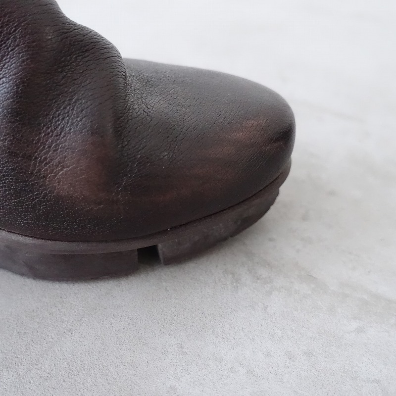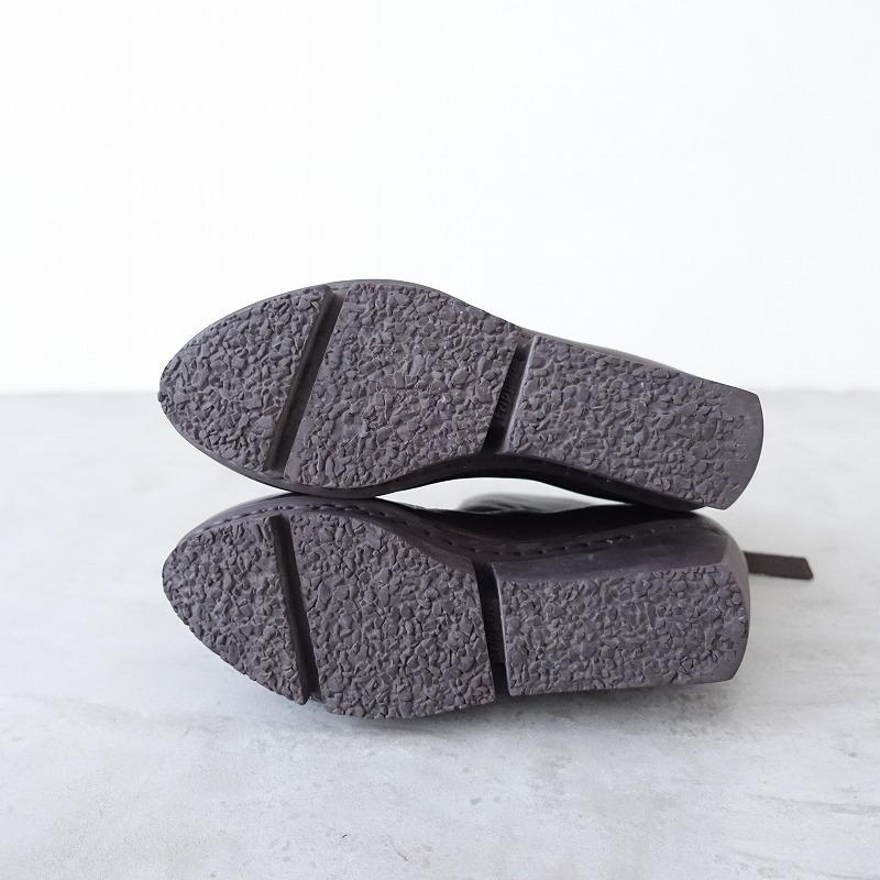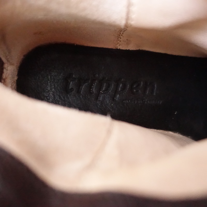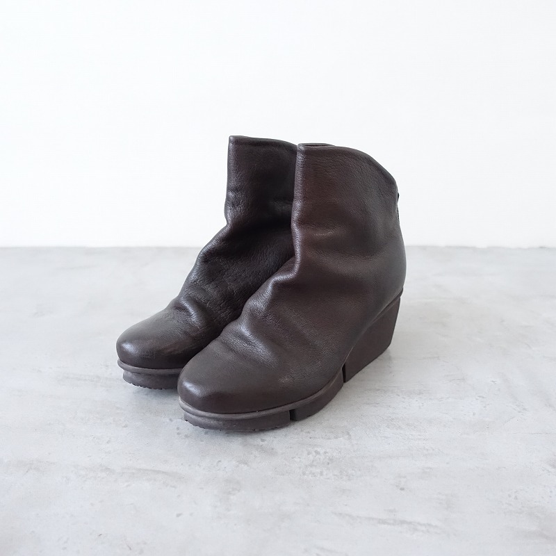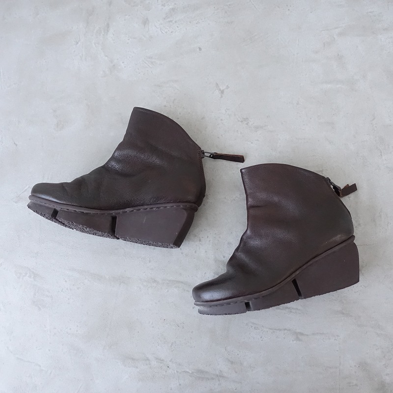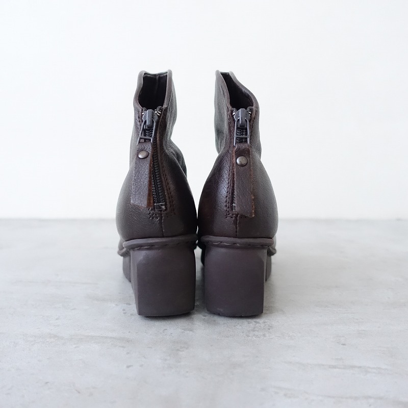 | trippenのMAGDALENA サイドジップショートブーツです。カラーはダークブラウンで、レザー素材です。履き口は斜めにカットされており、バックがファスナー仕様で、着脱足やすくなっております。 |