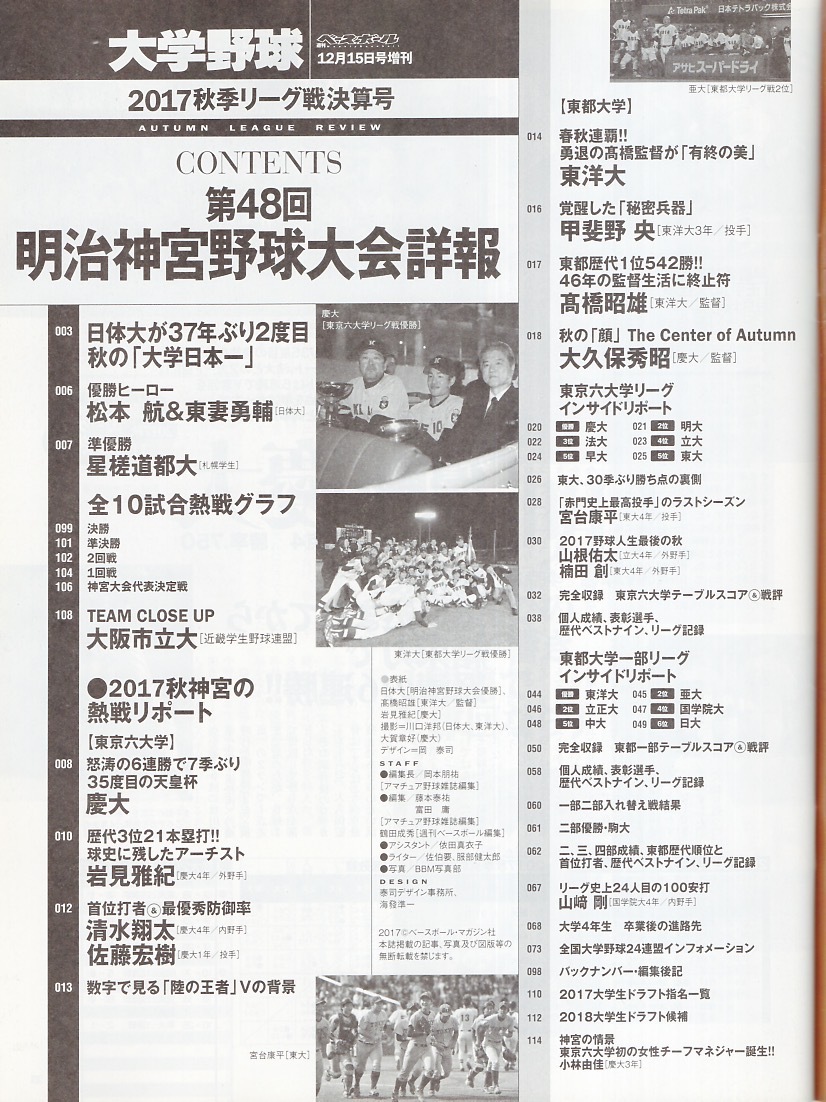 第48回明治神宮野球大会詳報 日体大が37年ぶり2度目 秋の「大学日本一」 優勝ヒーロー 松本 航&東妻勇輔[日体大3年/投手] 準優勝 星槎道都大[札幌学生] 全10試合熱戦グラフ 決勝 準決勝 2回戦 1回戦 神宮大会代表決定戦 TEAM CLOSE UP 大阪市立大[近畿学生野球連盟] ●2017秋神宮の熱戦リポート 【東京六大学】 怒濤の6連勝で7季ぶり35度目の天皇杯 慶大 歴代3位21本塁打!! 球史に残したアーチスト 岩見雅紀[慶大4年/外野手] 首位打者&最優秀防御率 清水翔太[慶大4年/内野手] 佐藤宏樹[慶大1年/投手] 数字で見る「陸の王者」Vの背景 【東都大学】 春秋連覇!! 勇退の高橋監督が「有終の美」 東洋大 覚醒した「秘密兵器」 甲斐野 央[東洋大3年/投手] 東都歴代1位542勝!! 46年の監督生活に終止符 高橋昭雄[東洋大/監督] 秋の「顔」The Center of Autumn 大久保秀昭[慶大/監督] 東京六大学リーグ インサイドリポート [優勝]慶大 [2位]明大 [3位]法大 [4位]立大 [5位]早大 [6位]東大 東大、30季ぶり勝ち点の裏側 「赤門史上最高投手」のラストシーズン 宮台康平[東大4年/投手] 2017野球人生最後の秋 山根佑太[立大4年/外野手] 楠田 創[東大4年/外野手] 完全収録 東京六大学テーブルスコア&戦評 個人成績、表彰選手、歴代ベストナイン、リーグ記録 東都大学一部リーグ インサイドリポート [優勝]東洋大 [2位]亜大 [3位]立正大 [4位]国学院大 [5位]中大 [6位]日大 完全収録 東都大学テーブルスコア&戦評 個人成績、表彰選手、歴代ベストナイン、リーグ記録 一部二部入れ替え戦結果 二部優勝・駒大 二、三、四部成績、東都歴代順位と首位打者、歴代ベストナイン、リーグ記録 リーグ史上24人目の100安打 山﨑 剛[国学院大4年/内野手] 大学4年生 卒業後の進路先 全国大学野球24連盟インフォメーション バックナンバー・編集後記 2017大学生ドラフト指名一覧 2018大学生ドラフト候補 神宮の情景 東京六大学初の女性チーフマネジャー誕生!! 小林由佳[慶大3年] | |||