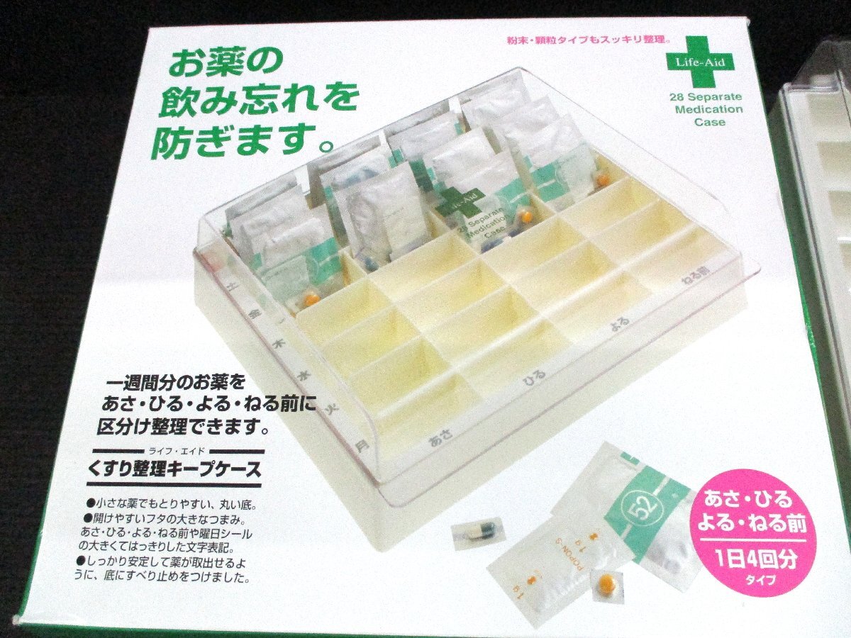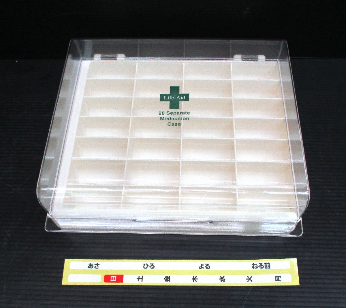| 付属品 | あさ・ひる・よる・よる前の4回分1週間を入れられる。 曜日と1日4回分仕分けシール。箱付 (写真参照) |