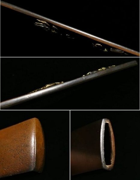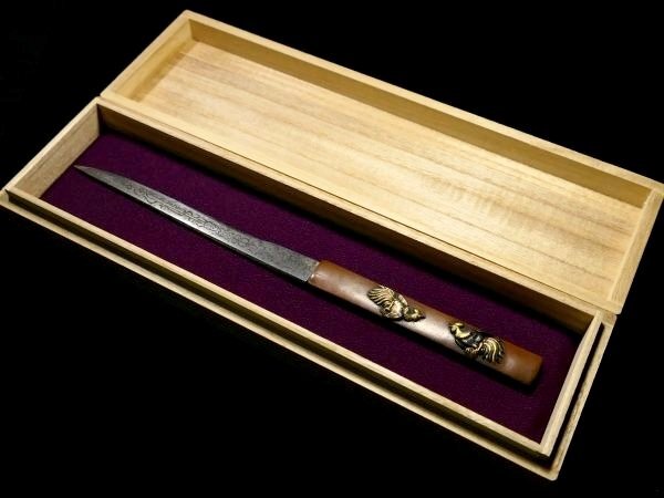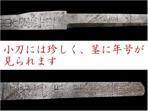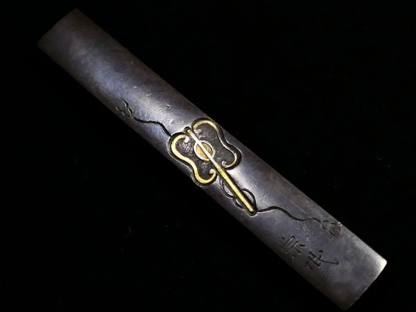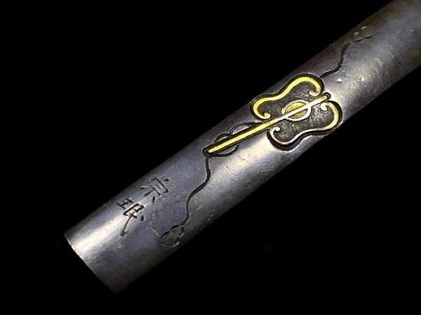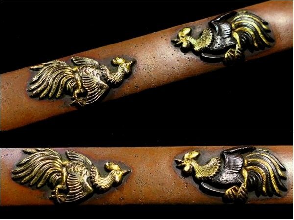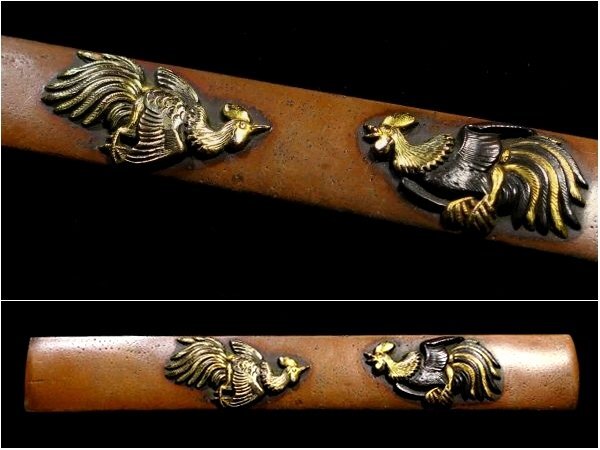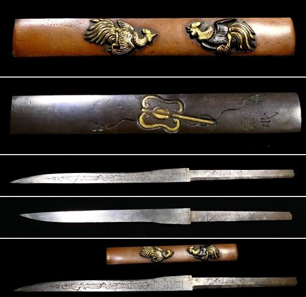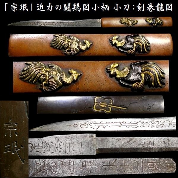 | 商品説明 | 見栄え良き金色絵に 躍動感ある闘鶏の図が施された 「(横谷)宗珉」 在銘の一品です。 小刀も付いており、 見応えある剣巻龍図の刀身彫刻に加え 小刀には珍しく、茎に年号も見られます。 拵え栄え抜群の一品と存じます。 この機会に是非手に入れて下さい。 【力強き細工】 【迫力ある闘鶏図】 【剣巻龍図小刀付】 寸法: (全長) 約 22.2cm (小柄のみ) 約 9.62cm × 約 1.41cm 時代: 江戸時代 材質: 素銅地 桐箱付 銘 : (小柄) 宗珉 (小刀) 應需一直造之 弘化四年末十二月日 状態:気になる傷みはなく概ね良好。 多少の小傷くらいはございますが 大きく観賞を損なうことは無いと思われます。 画像にてご判断下さい。 :許容範囲内の時代傷みはご理解下さい。 |