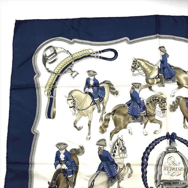 良品 HERMES エルメス カレ90 REPRISE 乗馬風景 大判 スカーフ シルク 100% ネイビー ブランド k4064 | |||