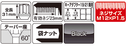 | T601B | M12×P1.5 | 19/21HEX兼用 | 26mm | ブラック | 4個入 | 208404 |