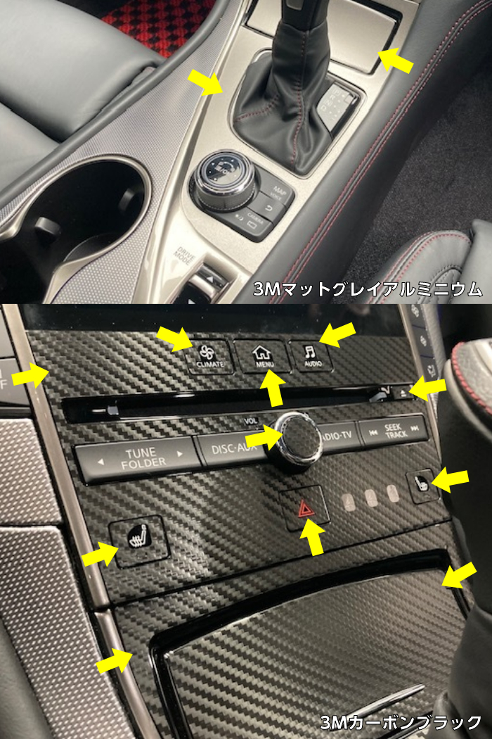 3Mシート使用シフトパネル&ナビパネルカット済みシート(シートヒーター付用) 細かい施工部位については画像をご確認ください。 MC.OP.グレード、仕様変更等で形状が違う場合がありますので現車をご確認ください。 ★材質:ソフト塩ビ ★屋外約2-3年(メーカー値、使用環境、シートの種類による)