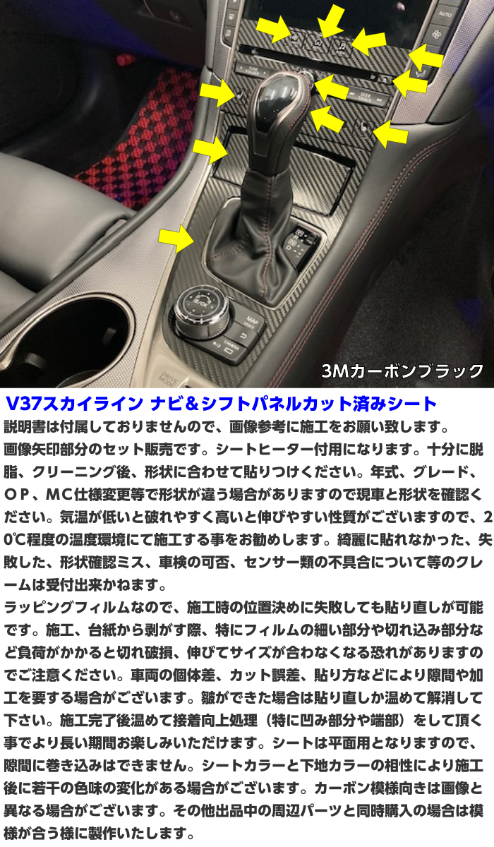 ※カーボンホワイト、ギャラクシーブラックは廃盤の為お選び頂く事ができなくなりました。 3M製以外は別ページで販売中です。 ※ご連絡なくお支払が終わっている場合はカーボンブラックにて発送させていただきます。 ③車両専用ラッピングシート ラッピングシートは剥がす際に糊残りがしにくく、貼り付けに失敗した場合でも 貼り直しが可能です。 当店では、雨、紫外線、風埃、熱等の環境が過酷な自動車には車両専用のシートをご使用される事を推奨しております。 ◆商品詳細◆ ★商品名: スカイラインV37系