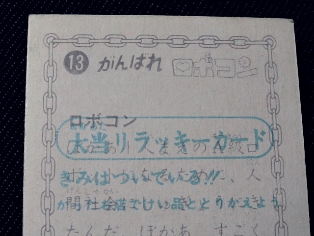 がんばれ!!ロボコン ミニカード バラ売り 1枚 ・メーカー:天田(AMADA) ・サイズ:6.5 cm x 5. 0cm (裁断により若干差異あり) ・発売時期:1970年代、当時の放送時に販売 ・状態:中古扱い 画像判断にてお願いします。 ・構成:1-7弾:各60種シリーズ(001-420・AL29種) ・発送:〒・同梱発送可能(送料が変わる場合があります。) 〓参考項目〓 ・放送期間:1974年10月4日から1977年3月25日 ・NETテレビ(現・テレビ朝日)系にて全118話 放送 ・原作:石森章太郎 ・連載:週刊少年サンデー、小学館学習雑誌、てれびくん、テレビランド 〓声の出演〓 ・ロボコン:山本圭子 ・ガンツ先生:野田圭一 ・ロビンちゃん:島田歌穂 ・ロボガリ:千々松幸子 ・ロボドロ:緒方賢一 ・ロボトン:緒方賢一(4話、33、34話、山田俊司)(8話-24話、加藤修) ・ロボペチャ:沢田和子 ・ロボクイ:はせさん治 ・ロボプー:永井一郎 ・ロボピョン:沢田和子 ・ロボショー:はせさん治 ・ロボガキ:加藤修 ・ロボゲラ:加藤修 ・ロボメカ:矢田耕司 ・ロボイヌ:肝付兼太(50話-55話、八代駿) ・ロボカー:北川国彦、永井一郎(最終話のみ) ・ロボリキ:増岡弘 | ||