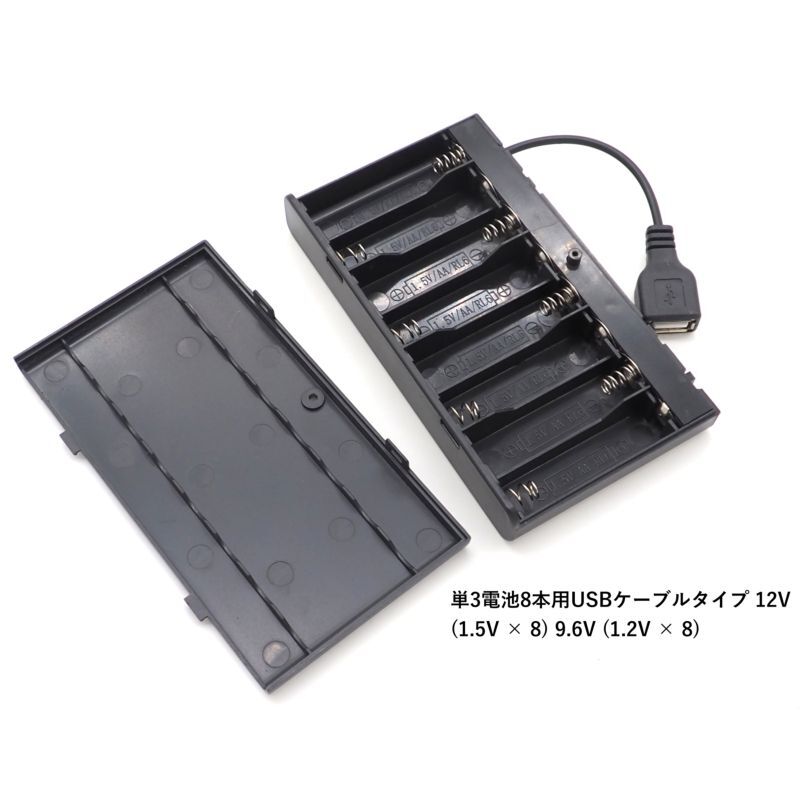 単3電池8本用USBケーブルタイプ 12V (1.5V × 8) 9.6V (1.2V × 8)USB出力:USB A(メス)ON/OFFスイッチ付き