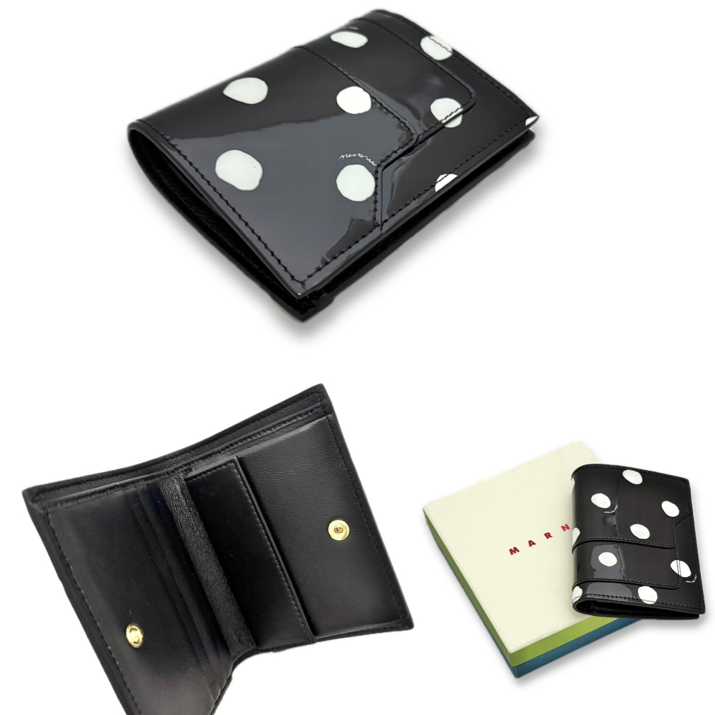 | イタリア発のラグジュアリーブランド【MARNI(マルニ)】より、ドット柄が愛らしいエナメルレザーの二つ折り財布が登場。光沢感のあるブラックのエナメル地に、手描き風ホワイトドットが映える洗練されたデザインで、個性的かつ上品な印象を与えます。 内側にはスナップボタン開閉のコインポケットとカードポケットを備え、ミニバッグにも収まるコンパクトサイズながら、機能性も抜群。デイリー使いはもちろん、誕生日や記念日のギフトにもおすすめの一品です。 |