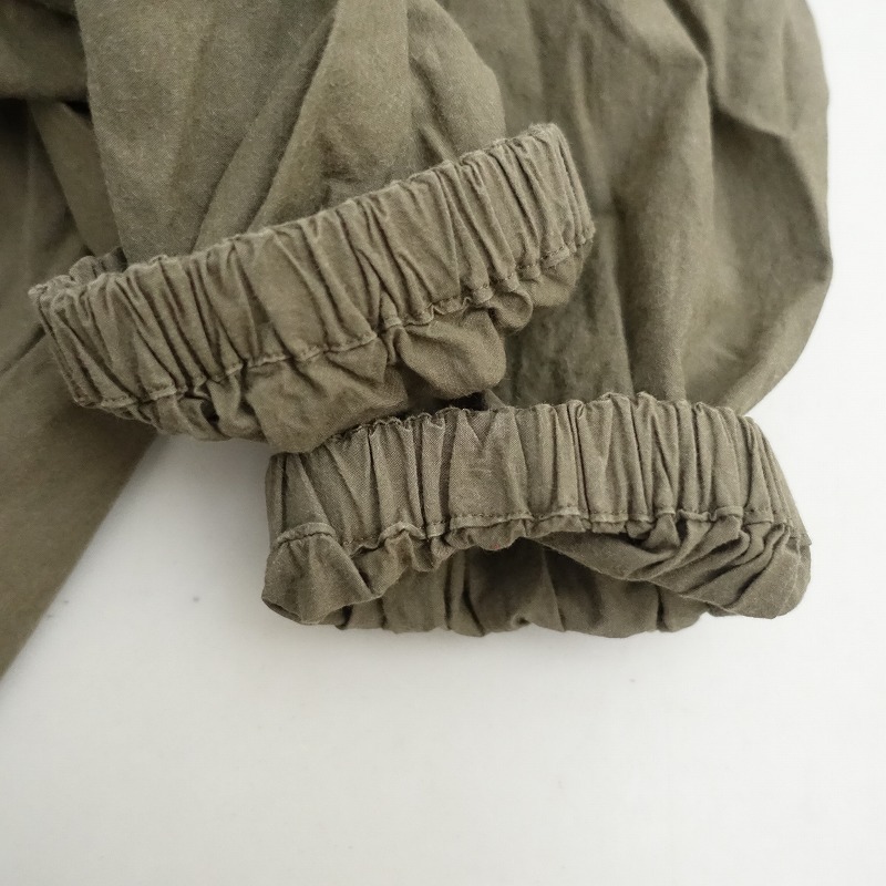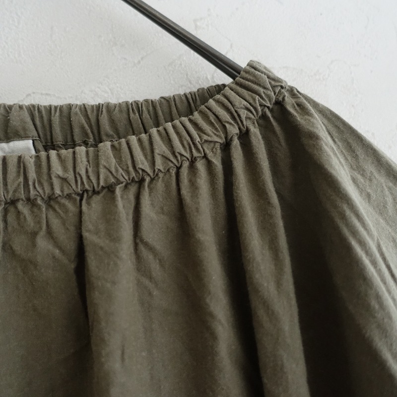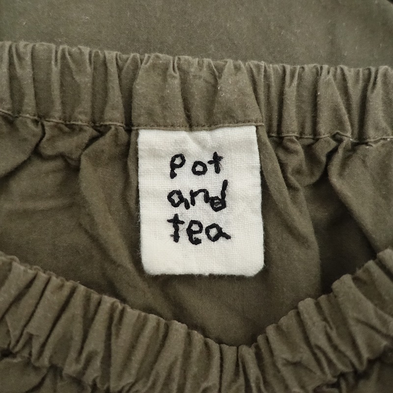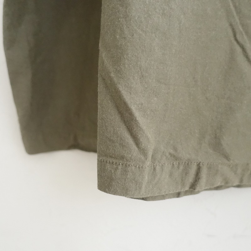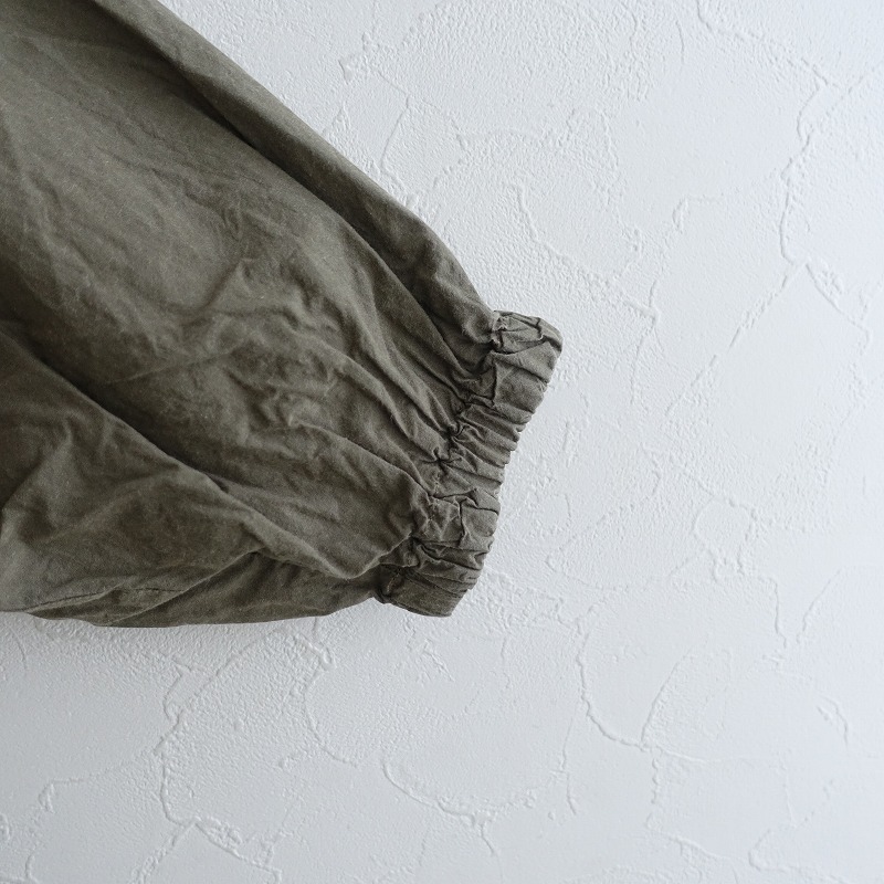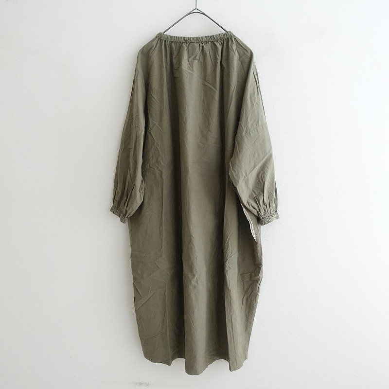 | Pot and teaのスモックボリュームワンピースです。カラーはグリーンカーキで、張り感のあるコットン地で仕立てられています。プルオーバータイプで、袖口はゴム仕様です。ワイドなシルエットで、両サイドにシームポケット付きです。 |