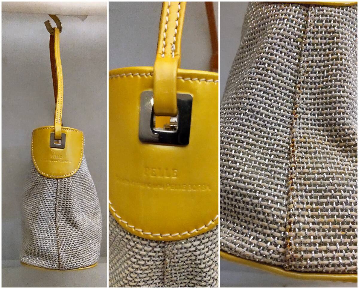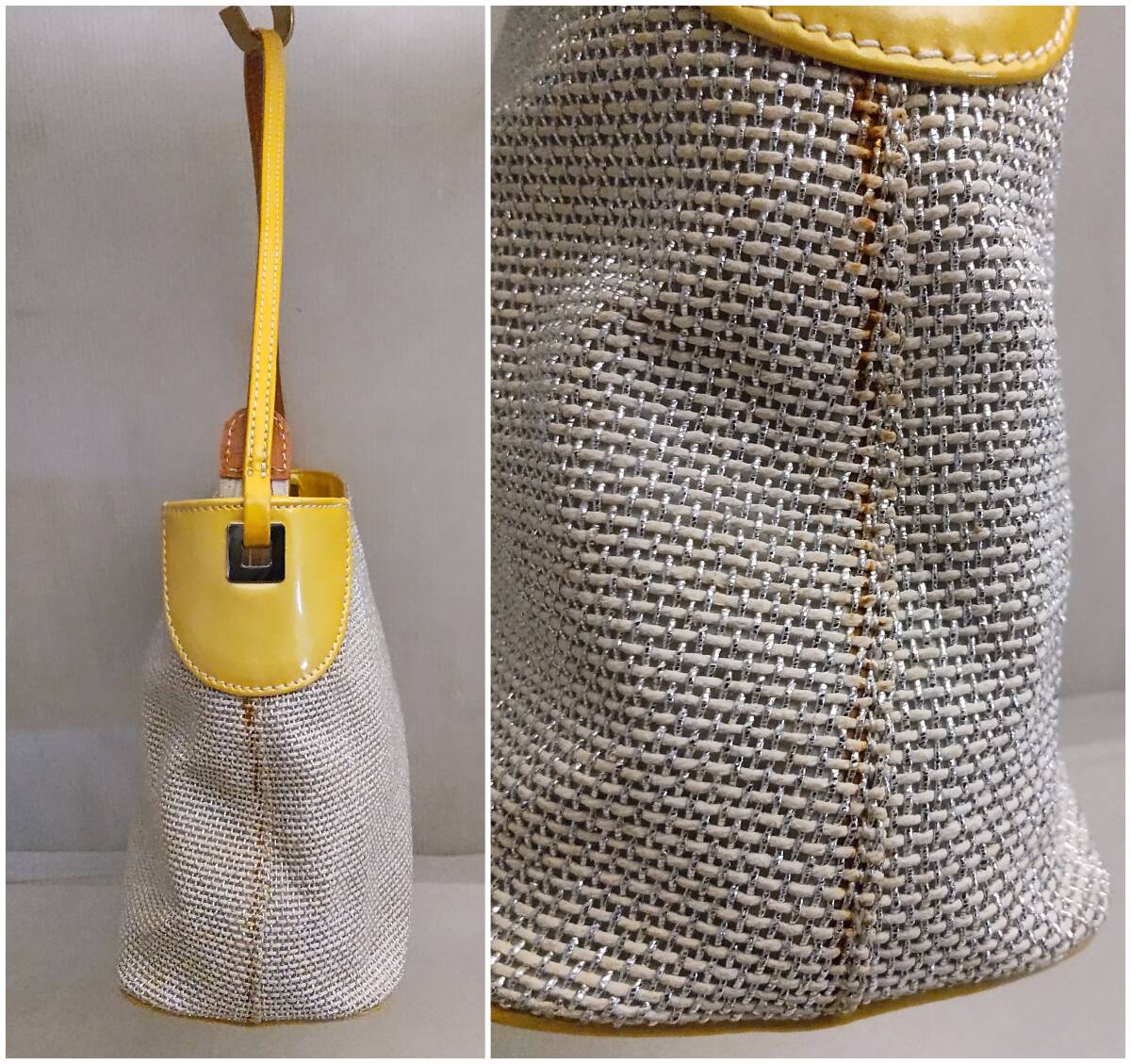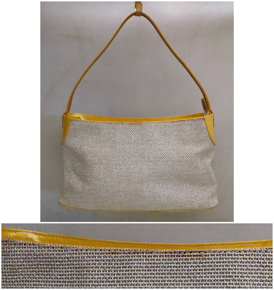 素材は ラメ入り布地×レザー カラーはオフホワイト×シルバーカラー×イエロー 幅約29cm 高さ約16cm マチ約10cm ややスレキズ汚れや型崩れが見られます。 バッグ表面に、バッグに使用されたであろう接着剤が劣化した茶色いシミが浮き出ている部分があります。画像5,6左、画像7下 やや難ありとさせて頂きます。 また、底のレザーの部分に色ムラが見られました。画像5 | ||||