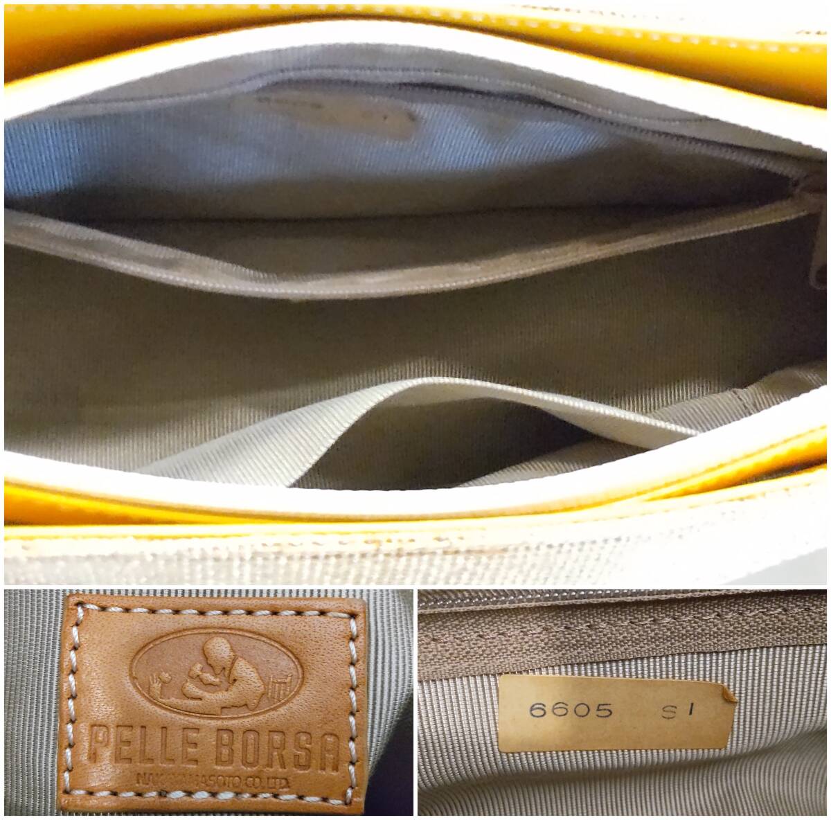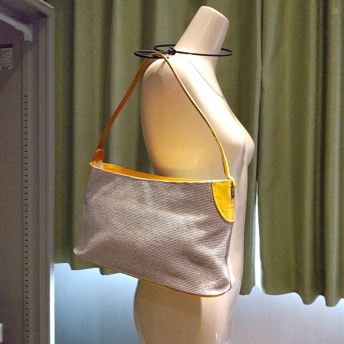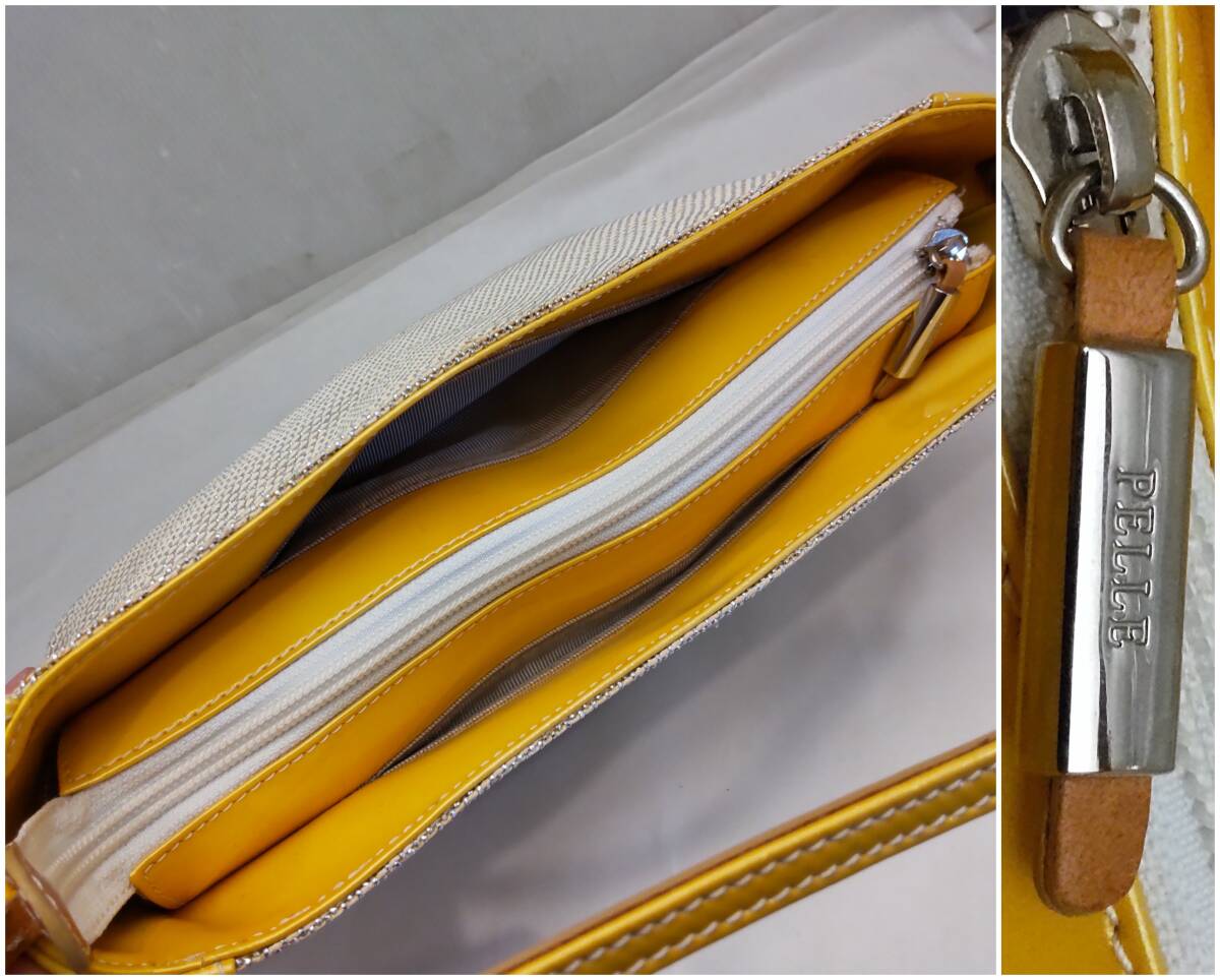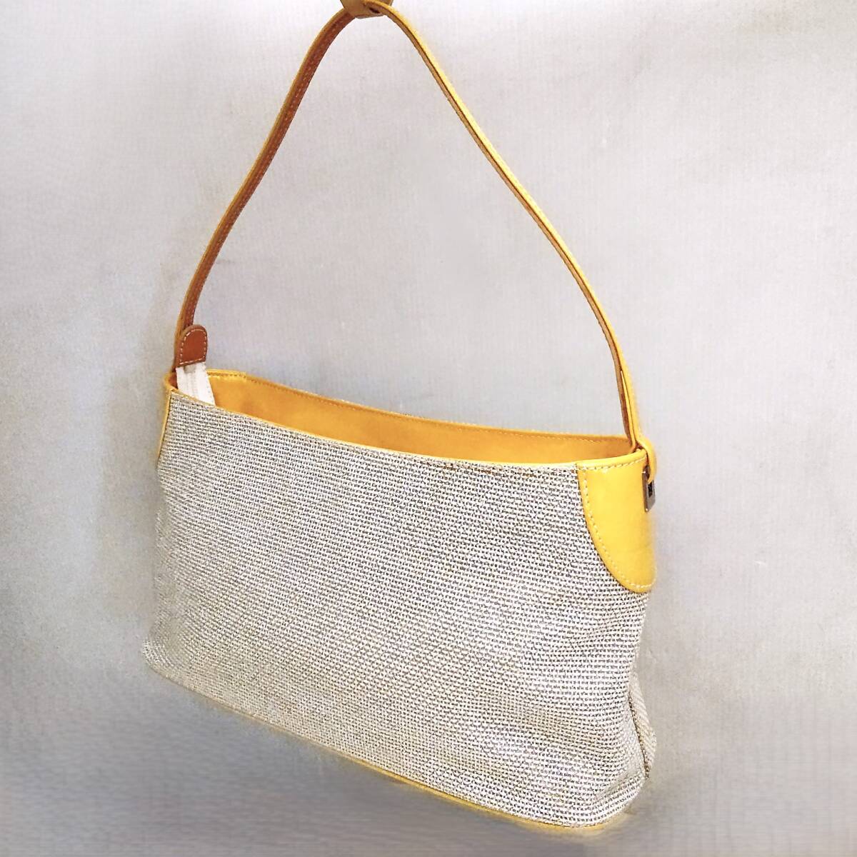 素材は ラメ入り布地×レザー カラーはオフホワイト×シルバーカラー×イエロー 幅約29cm 高さ約16cm マチ約10cm ややスレキズ汚れや型崩れが見られます。 バッグ表面に、バッグに使用されたであろう接着剤が劣化した茶色いシミが浮き出ている部分があります。画像5,6左、画像7下 やや難ありとさせて頂きます。 また、底のレザーの部分に色ムラが見られました。画像5 | ||||
