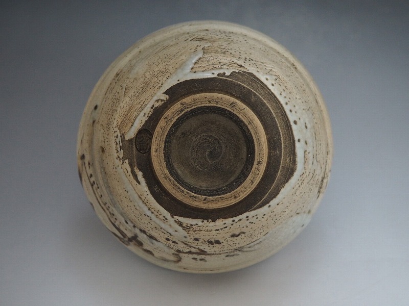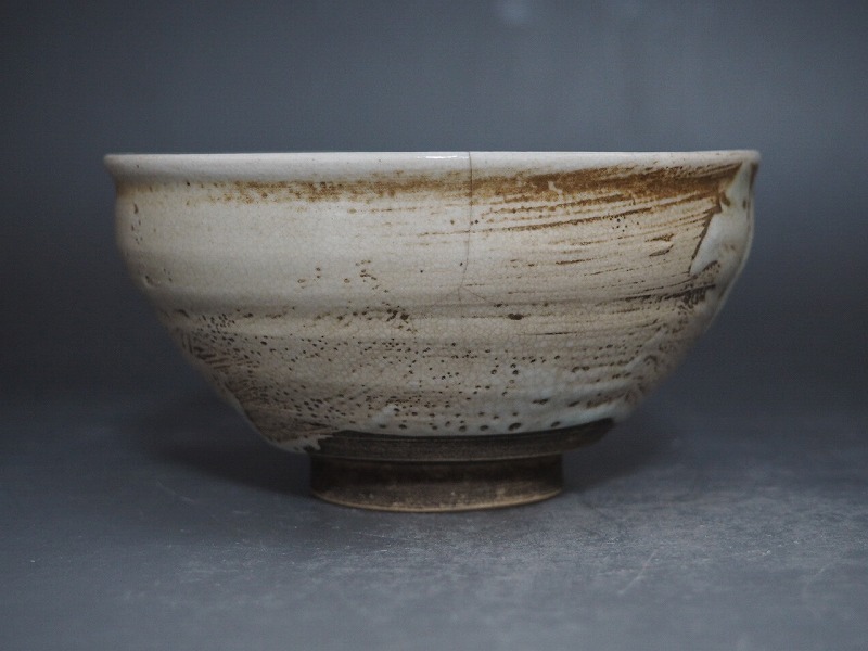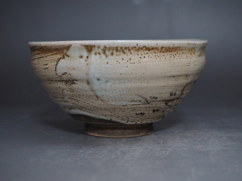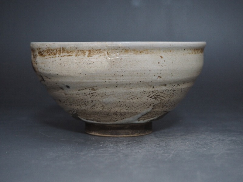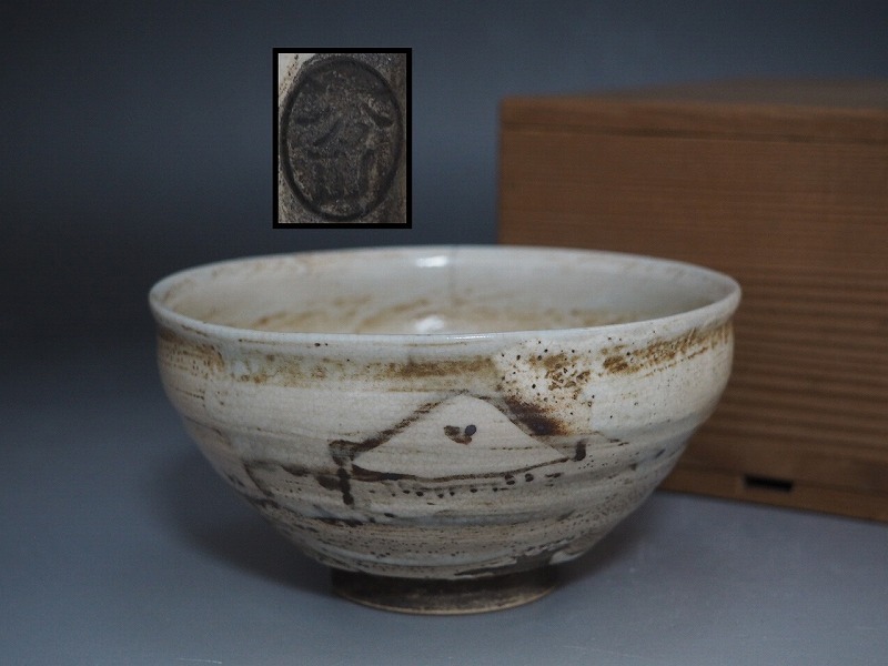| A4486 秀山 作 時代茶碗 木箱付 ☆ 旧家蔵出 骨董 古い 古玩 古美術 茶道具 茶碗 抹茶碗 古茶碗 古志野 雨漏粉引 陶器 作家物 在銘 陶印 | ||