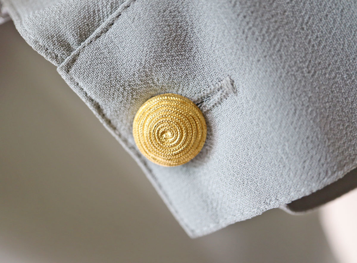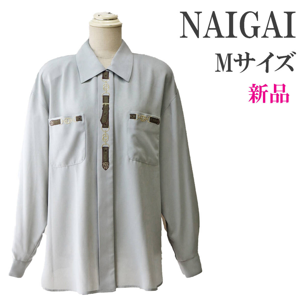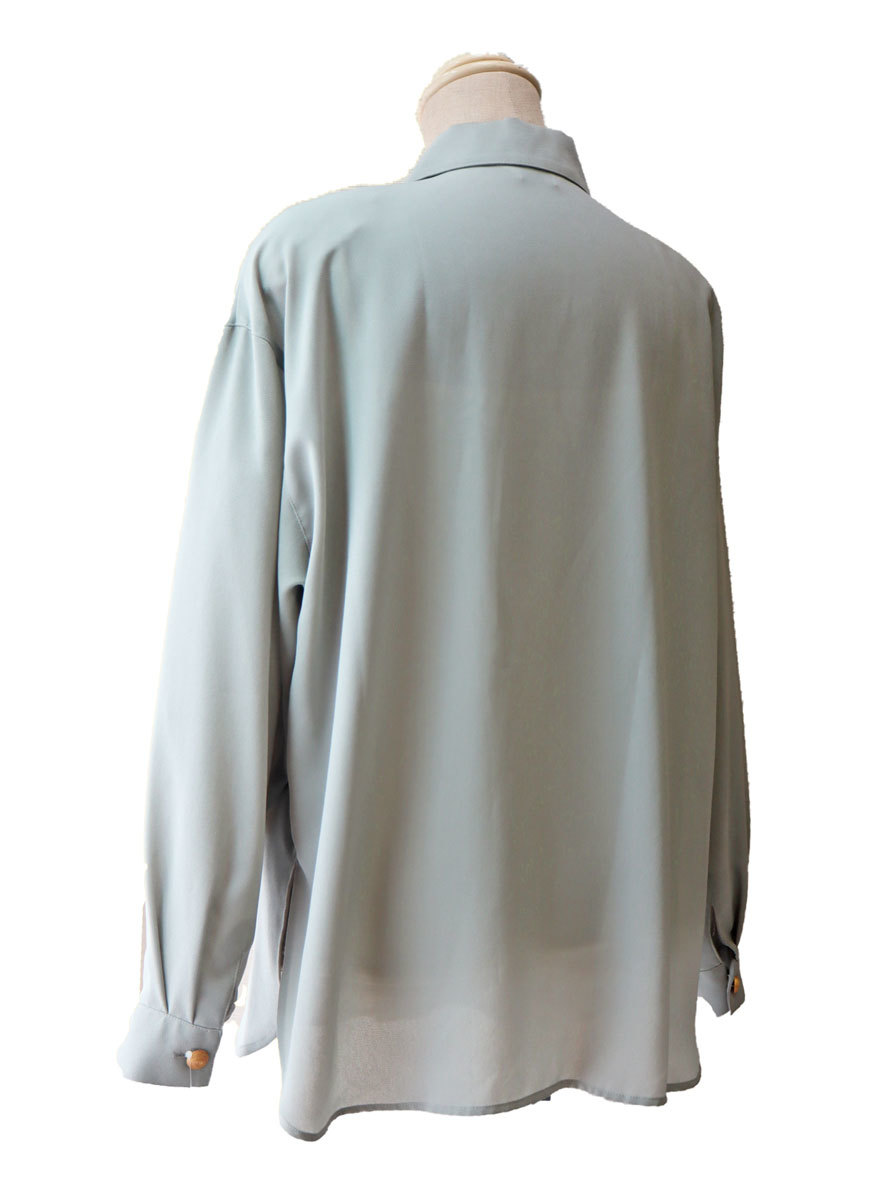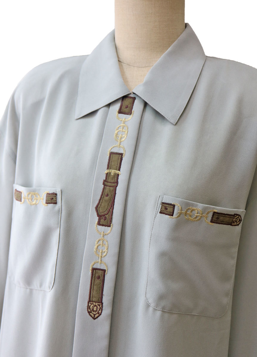 ナイガイ 風見鶏 の 長袖ブラウス。 前開き。 ベルトの柄のミシン刺繍がかわいいです。 ステンカラー。 肩パットは軽く縫い付け。 取り外すこともできます。 肩はドロップ。 前立ては、比翼仕立て。 袖口はカフス仕立て。 ボタンが渦をまいていてかわいいです。(画像参照) 胸ポケットあり。 裾はラウンド。 脇スリットあり。 9号表示ですが、ゆったりできています。 下記の実寸をご参考下さい。 ◆色:グレー ◆サイズ:バスト83(できあがり104) 着丈68 肩幅52 袖丈51 ◆素材:ポリエステル ◆メーカー希望小売価格(税抜き):正規の値札が外れています。 こちらのブランドの相場から、@14000前後と推測します。 ◆ストレッチ:あり5-4-3-2-●なし ◆厚さ :厚い5-4-●-2-1薄い ◆備考: デッドストックです。 落札の際は、上記の旨、ご了承下さい。 | |||