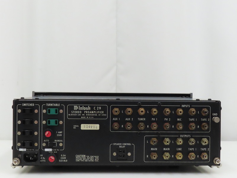■メーカー : McIntosh ■型番 : C29 ■外径寸法 : W406×H138×D330mm ■重量 : 8.6kg 【商品の状態 当店での確認内容】 音声出力は確認出来ておりますが、BASSツマミにガリがございます。また、TAPE1スイッチランプが消灯しません。 文字ランプに点灯しない箇所がございます。前面ガラスに気泡もございます。 「商品の状態」に関しましては当方主観の目安となります。外観などは中古品で個人差もありますので詳細は画像にてご判断ください。 画像にて不明な点はご質問下さい。 出品商品は画像のものですべてになります。画像に写っているもの以外は付属いたしません。 ※注意※ のシステム上、送料表記が送料未定となっておりますが、送料に関しては全て有償となりますので下記を参照下さい。 【送料 全国一律 2,080 円 沖縄、離島は別途お見積り】 ※送料がお得になるサービスです(下取りシステムのご案内です) 当ストアでは商品を安全にお届け出来るよう提携運送会社と協議の上、発泡緩衝材や強度段ボールの使用等 運送会社が指定する梱包方法や資材を採用しております。 より安全にお届け出来るよう商品仕様により梱包サイズが大きくなる場合や個口数が増える事がございます。 【当ストアオークションルールを入札前に必ずご確認ください。】 【落札後の取引手順】 ・落札後は取引ナビにて、必要事項をご入力後、送信ください。 取引終了後48時間(土、日は除く)以内に入力をお願い致します。 ※ご連絡が頂けない場合は落札者様都合でのキャンセルとさせていただきます。 ・落札代金(商品代金+消費税+送料)の入金をお願い致します。 ※大型商品の場合は送料確定後の決済となる為取引ナビを入力頂き、当ストアより送料のご案内が来るまでお待ちください。(土曜、日曜、祝日の場合は翌営業日より順次ご案内いたします) ・お支払い方法は※クレジットカード/※PayPay残高/※PayPayクレジット/PayPay銀行/ゆうちょ銀行のみです。 ※商品代金引換(代引き)のお取り扱いはしておりません。 ※領収証の発行が必要な方はご連絡ください。 ※銀行振込の際の振込手数料はご負担願います。 ・入金確認後に出荷手配を致します。 (原則入金確認後3営業日以内に発送いたしますが、大型や重量のある製品はお時間をいただく場合もございます。) ・発送は当店指定の運送会社の元払いのみでの発送となります。 ※他の運送会社、送料代引き等は致しかねます。 ※落札者様ご自身での運送会社の手配いただく事も可能ですが荷物事故の責任の所在の問題上、梱包は致しかねます。 ※店頭にお越し頂き手渡しも可能(福岡市早良区)です。ご希望の方はご落札後にご連絡下さい。 ・大型/重量物商品の送料につきましては商品の特性上、荷降ろし状況等により送料が大きく前後し運送業者に別途見積りが必要な為、早めのお問い合わせにてお見積り上、入札をお願い致します。 【初期不良の保証について】 ・商品到着後の初期動作不良、また配送中の事故による破損、不具合が有る場合は、商品発送後10日以内に当ストアまでご連絡ください。当ストアでは修理での対応を優先させて頂きますが、修理不可の場合は全額返金させて頂きます。 (商品代金+消費税+送料のお支払い頂いた金額となります) 【初期不良の保証の対象外について】 次の場合は保証の対象外となりますのご留意ください ・ジャンク商品、現状商品、難あり商品での出品商品。 ※難あり商品に関しましては動作確認時に一部動作不良が確認された商品になり、記載している動作確認以外にも、動作不良がある可能性もございます。こちらに関しましても保証対象外となりますことをご理解ください。 ・年代物のオーディオなどで、当店にてわからない範囲で部品が交換されている場合 ・楽器類の特殊機材(マイクロスコープ等)での確認までは行っておりません。気になる方は事前にご質問いただくか、入札をお控えください。 ※初期不良に関しましては【商品の状態】に記載のもの、またそれによって起因する動作不良は対象外です。 ※商品発送後10日を過ぎてのご連絡は対応が出来ませんので、商品が到着しましたらお早めに確認をお願い致します。 【メーカー保証の加入・継承】 ・未使用品、展示品やメーカー保証期間が残っている商品に関しまして、メーカー保証の加入、継承が必要な方は、落札後取引ナビ内にて当ストアにお知らせください。商品発送までにご連絡いただけない場合、メーカー保証の手続きを承れない場合があります。 【評価について】 ・評価不要の場合、必ず取引ナビの「要望欄」にてお知らせください。それ以外でご連絡をいただいた場合、対応できない可能性がございます。一度行った評価はシステム上取り消しが行えませんのでご了承ください。 【入札削除・キャンセルについて】 ・入札後はトラブル防止の為いかなる事情がおきましても入札を削除等は致しておりません。 ご検討の上入札をお願い致します。間違った際の入札額の