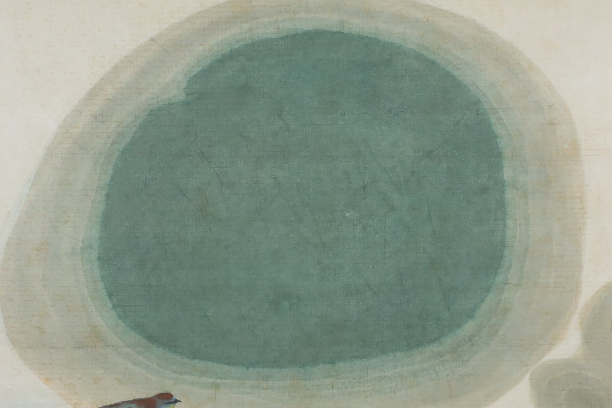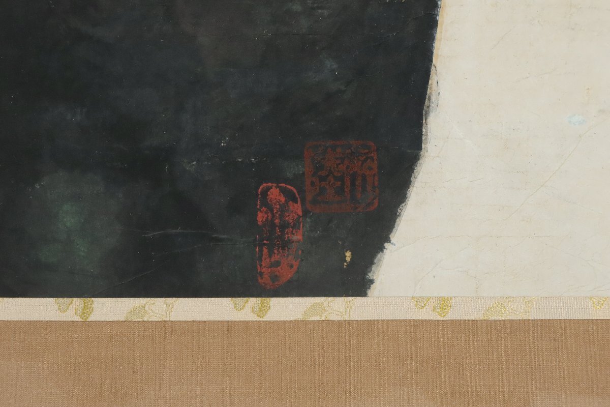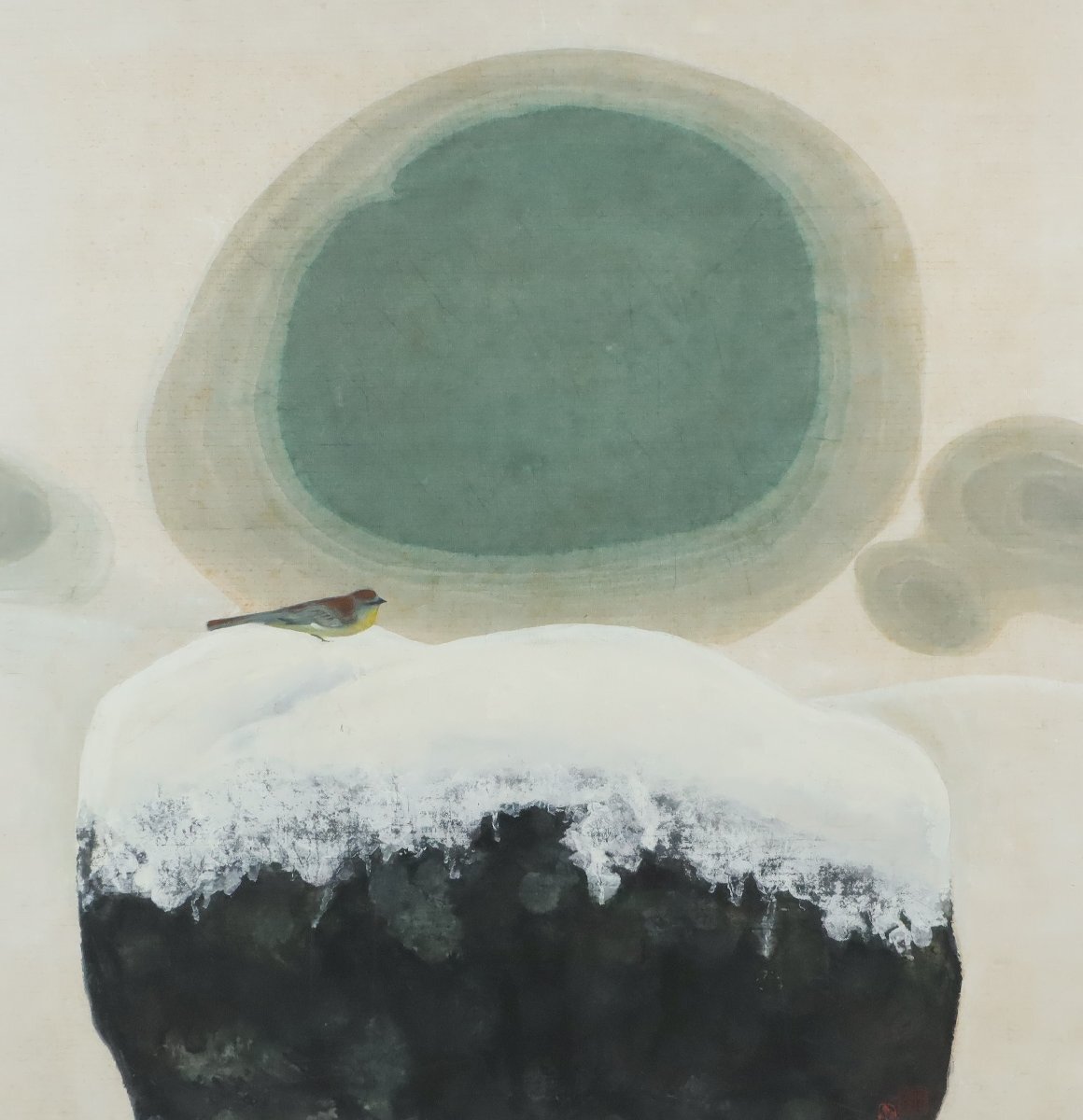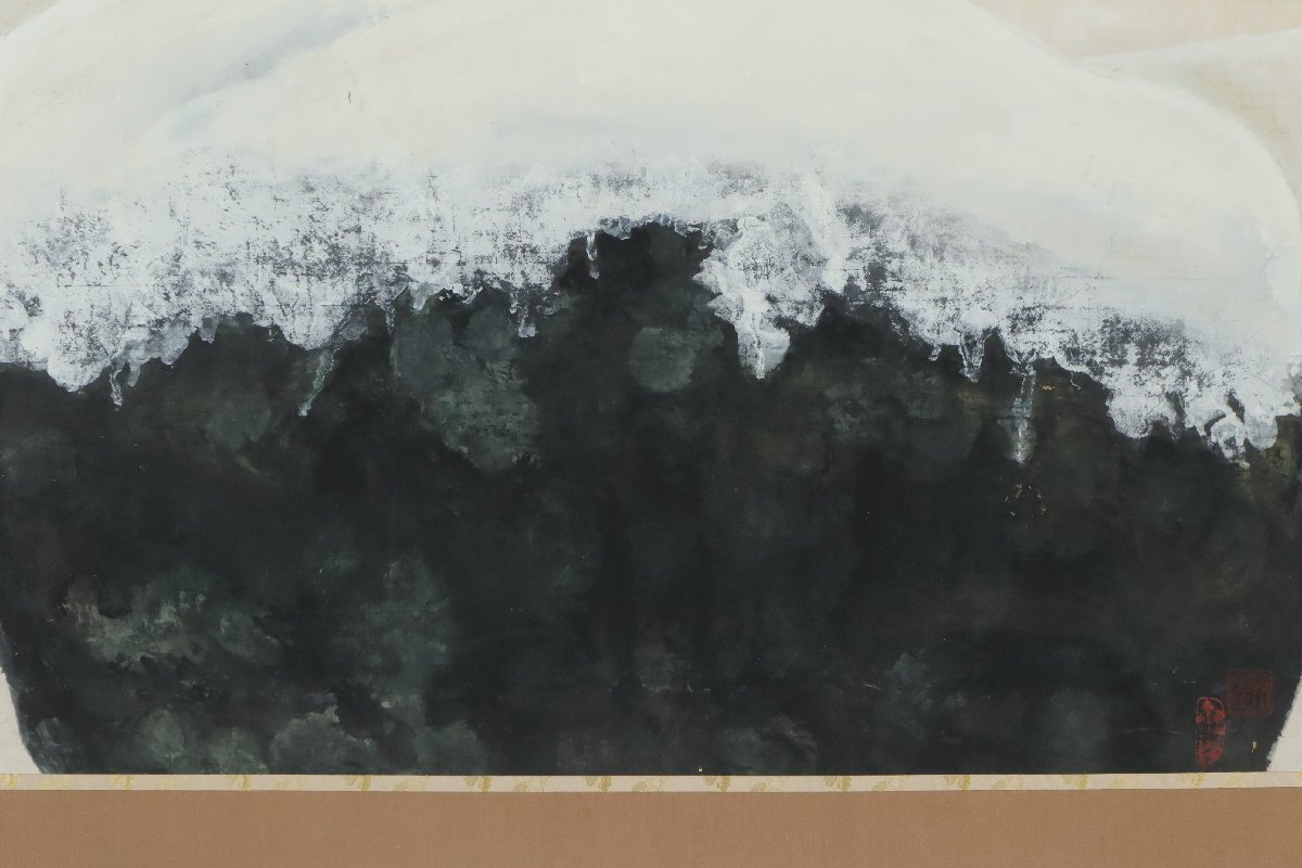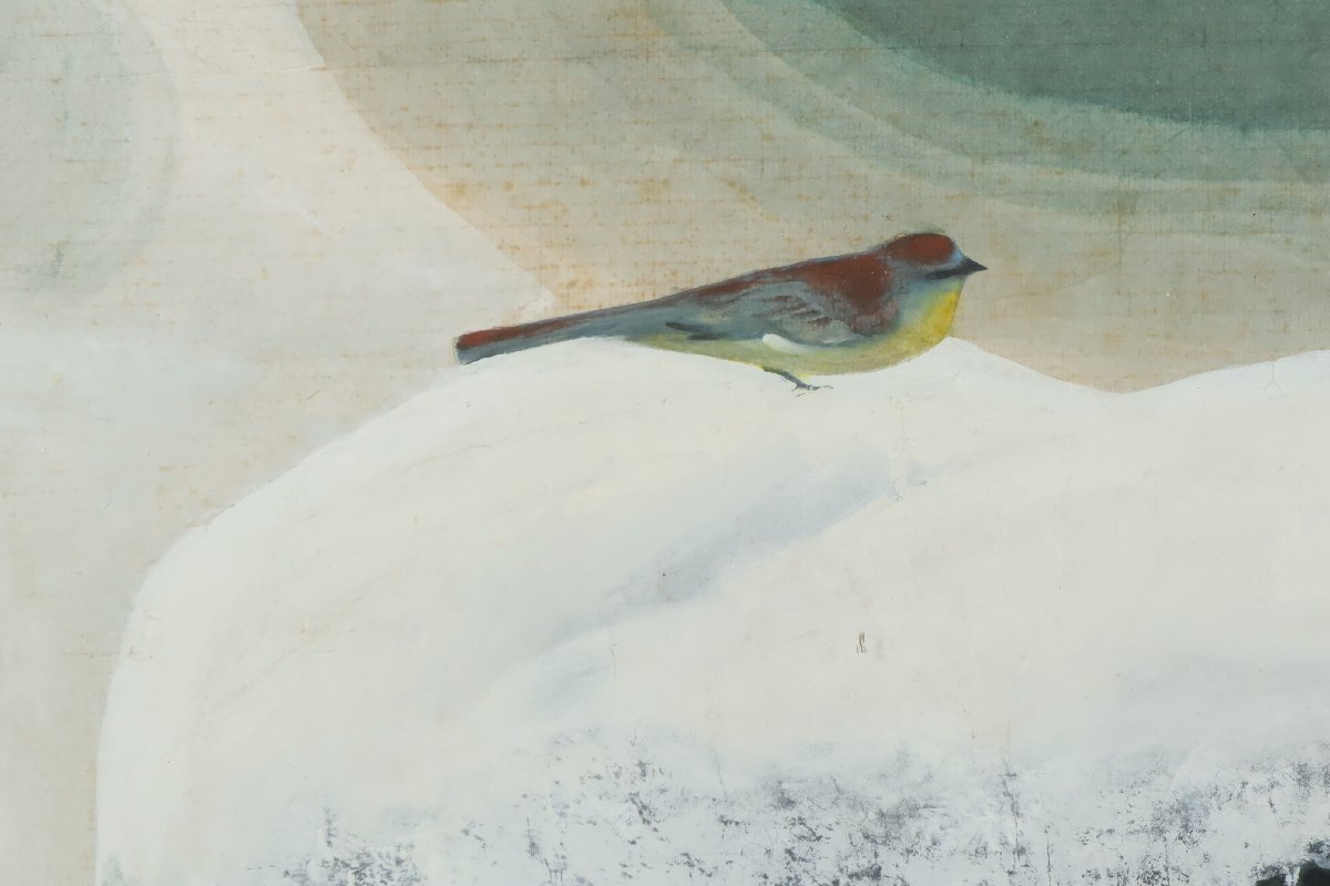 | ・日本画「雪に鳥」陸齋銘 紙本 大型 額装品 260 /岩彩画 大作 作者不明 在銘 |