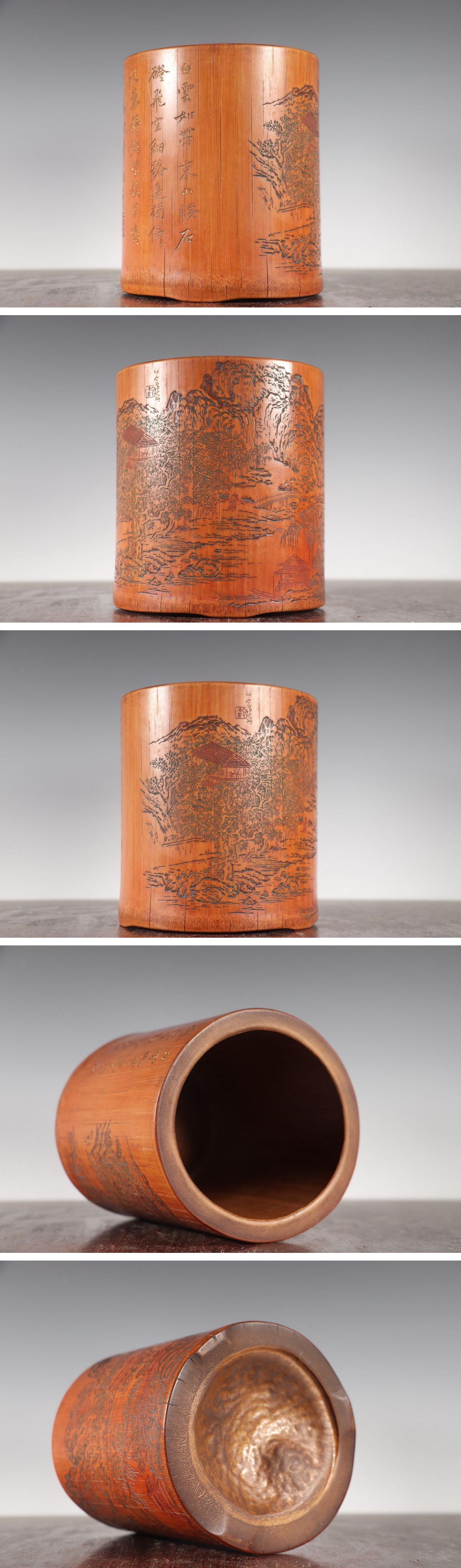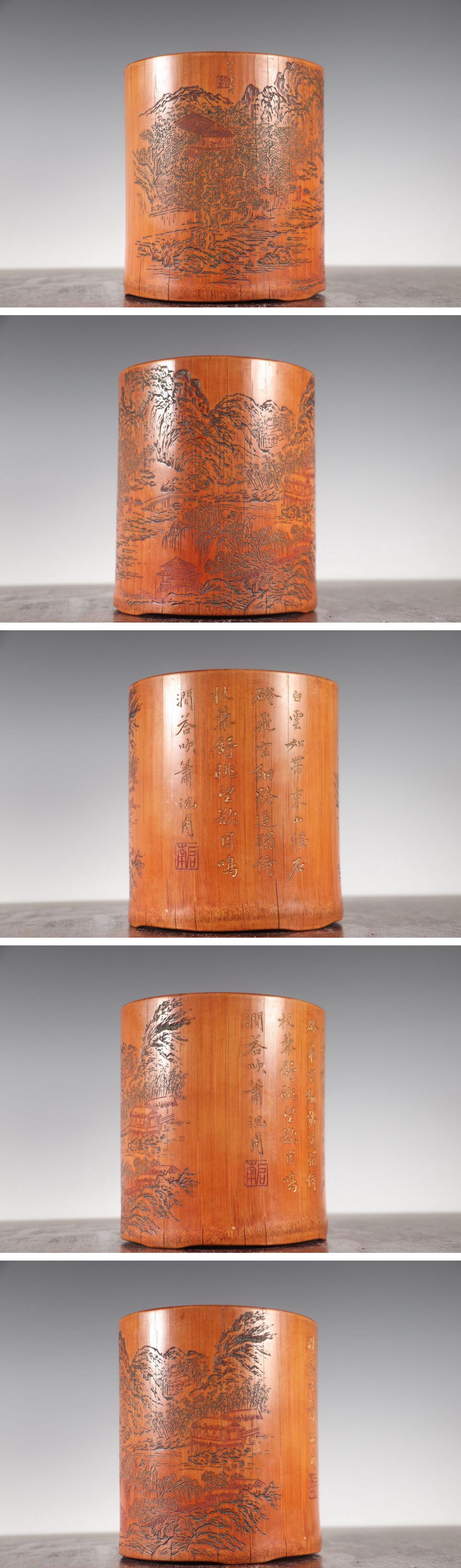 【清】某有名オークション購入 清時代 古竹彫り 山水漢詩紋筆筒 当時物保証 古置物 古擺件 古美術 時代コレクション7L10-XS5