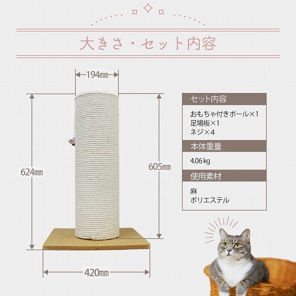 約20cmのポールで思う存分つめとぎ放題♪ ネコちゃん大満足に間違いなし! じゃれて遊べるおもちゃ付き。 ■商品仕様 サイズ(約):420×420×624mm 重量(約):4.06kg 材質:麻、ポリエステル ■注意事項 ・こちらの商品はお客様組み立てとなります。 ・製品は接着剤や麻の臭いがすることがあります。臭いが気になりましたら、風通しの良いところで陰干ししてください。 ・海外製品で、簡易梱包での輸入のため風防に擦れや多少の小キズなどがある場合がございますが、商品自体には問題ありませんのでご了承下さい。 ・仕様・デザインは改良のため予告なく変更することがあります。 |