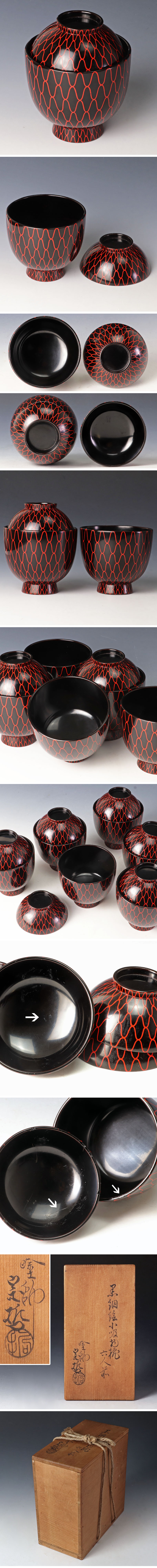 蓋にシミあり、一客の蓋と椀に塗直しあり(写真矢印部分参照) |