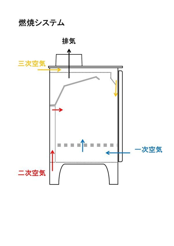 ■装備 二次燃焼システム、灰落とし機能付、灰取りトレイ付