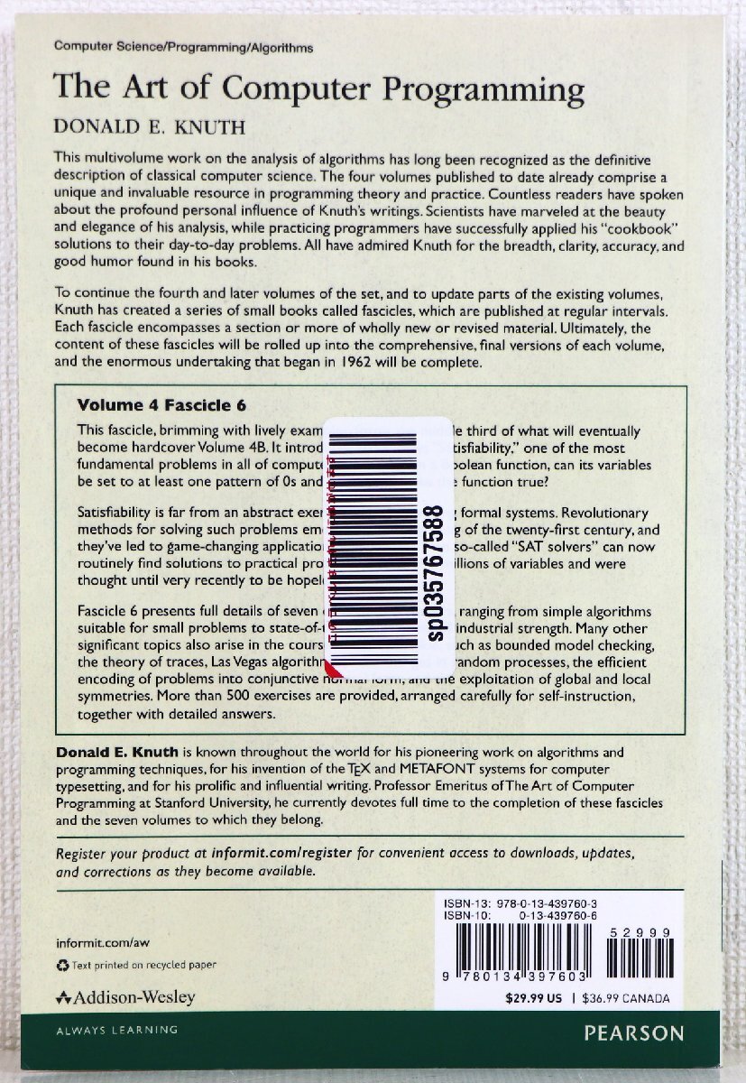 (4084149K) ◆中古品です。 洋書 『The Art of Computer Programming VOLUME 4 Satisfiability FASCICLE 6』 著者:DONALD E.KNUTH/ドナルド・クヌース 出版社:Addison-Wesley/アディソン-ウェスリー ジ・アート・オブ・コンピュータ・プログラミング ボリューム4、ファシクル6 ◆付属品 付属品はありません。 ※商品写真に掲載したものが全てです。 ◆外観 表紙に使用感があります。 ページ内に目立ったキズ・ヨゴレ、書き込みはありません。 | ||||