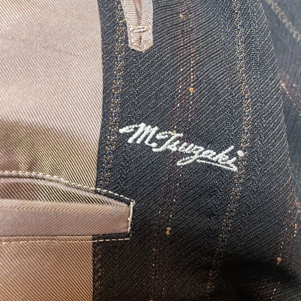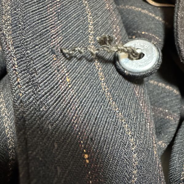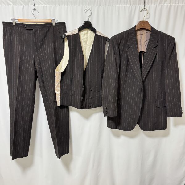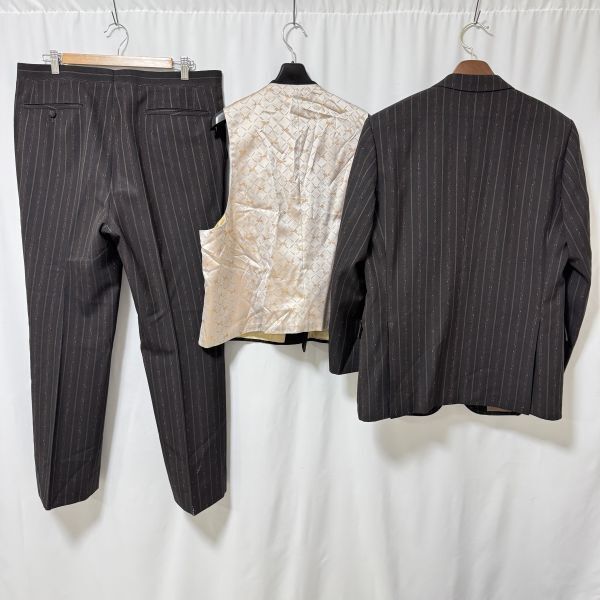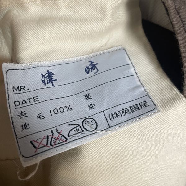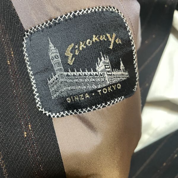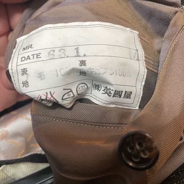 銀座の老舗テーラー「英國屋」によるオーダーメイドスリーピーススーツです。 1988年(昭和63年)製のヴィンテージモデルで、上質なウール100%素材を使用。 ブラウン系をベースに、ブラウンとレッドの糸を織り交ぜたストライプが印象的な一着です。 ジャケットは2ボタン仕様のクラシックスタイル。 同素材のベストとパンツが付属し、フォーマルにもビジネスにも活用できます。 裏地にはキュプラを採用し、通気性と滑らかな着心地を両立しています。 サイズ(平置き・約cm) ジャケット:肩幅44 身幅54 袖丈57 着丈83 ベスト:肩幅34 身幅53 着丈58 パンツ:ウエスト43 股上36 股下71.5 ヒップ52 ワタリ28 ※採寸はおおよその採寸です。 素材:表地 ウール100% 裏地 キュプラ100% 仕立て:株式会社 英國屋(銀座・東京) 生産国:日本製 ※ジャケットボタンがほどけています。 上品な配色と重厚な質感が魅力の1980年代英國屋オーダースーツ。 ビジネスシーンはもちろん、クラシックスタイルを楽しむ場にもおすすめの逸品です。 画像のものが全てです。