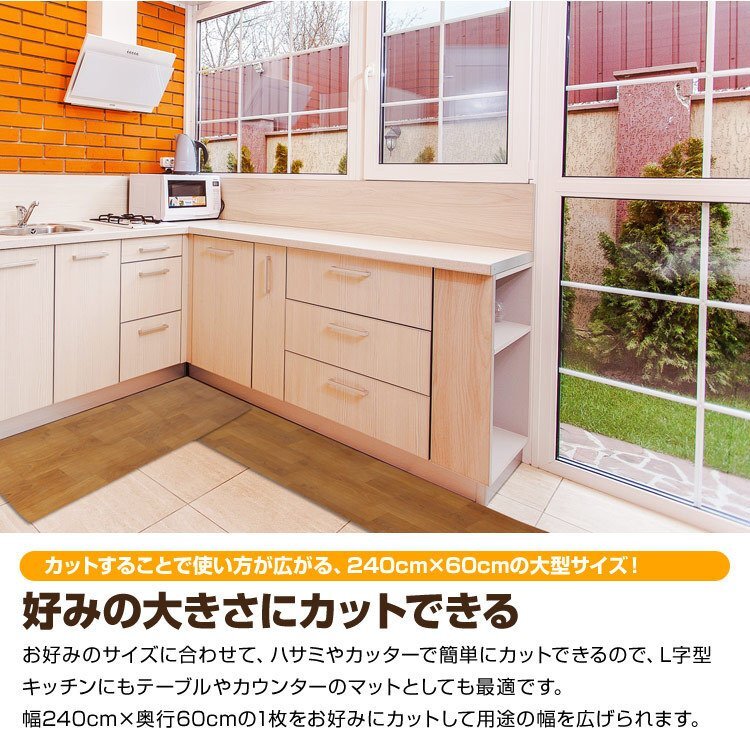 インテリアのアクセントや床に馴染みもよいデザインで、お部屋のイメージを損ねない!! 耐熱性があるので床暖房の上でも使用OK! 240cmの大型サイズで簡単にカットすることができるので、ダイニングテーブルやカウンターのマットとしても最適です! 【商品仕様】 カラー:木目調 サイズ(約):幅240cm×奥行60cm(厚さ1.6mm) 重量(約):3.0kg 材質:PVC(ポリ塩化ビニール) 使用温度(約):−30℃〜70℃ ※お手入れは薄めた中性洗剤を湿らした布につけ、固く絞って拭いた後、水分が残らないように乾いた布で乾拭きしてください。 ※日の当たる所で使用しないでください。日焼けで硬化する場合があります。 |