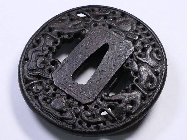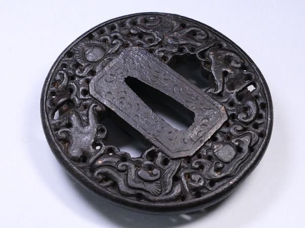 | 商品説明 | ~寸法~ 約 7.40cm× 約 7.15cm× 約 0.63cm(切羽台の厚み) 重量 約 136.2g 良く鍛えられた厚み6mm以上の重厚な鉄地に 力強き透かし細工の双龍唐草図の施された 見応えある南蛮鍔の優品です。 桐箱がございます。 大切にして頂ける方の元へ届けば幸いでございます。 ~状態~ 全体的に見て状態は概ね良好です。 画像にてご確認下さい。 許容範囲内の時代傷みはご理解下さい。 |