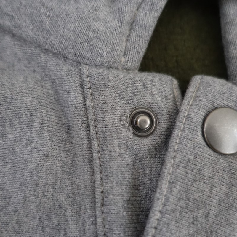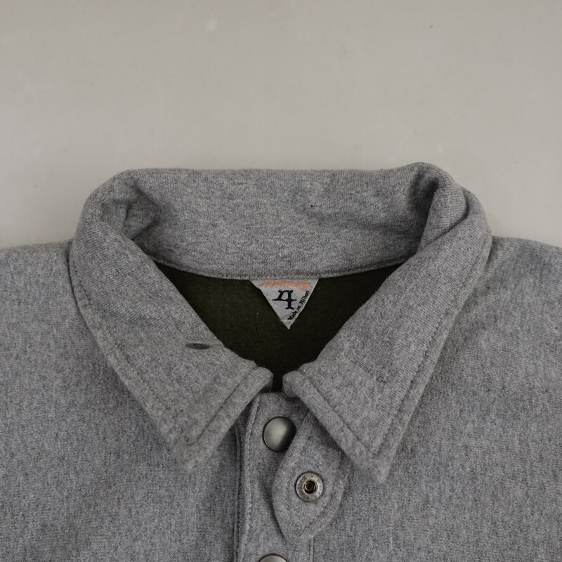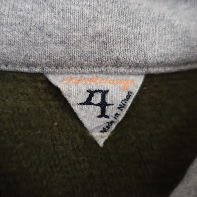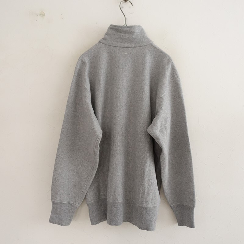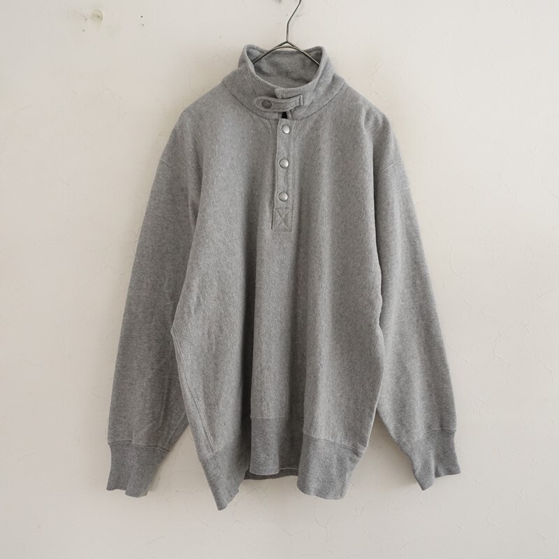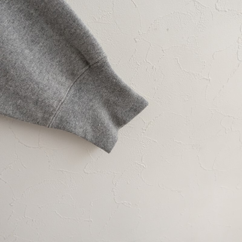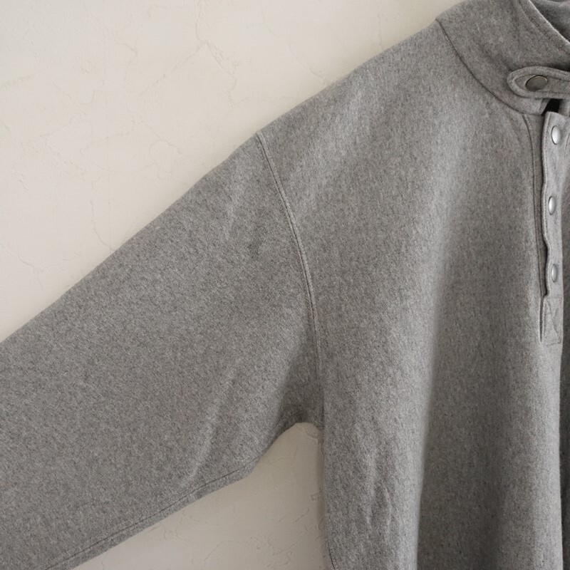 | FilMelangeのMACEDO 裏起毛スウェットプルオーバーです。カラーはライトグレー杢です。裏側にオリーブ色の起毛を配したコットンスリット素材を使用。身頃は編み目を横に使用。チンタブ付きの衿が施され、胸元の前立てはドットスナップボタンを使用。ポケットはございません。 |