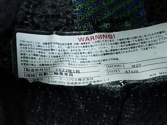 ある程度の使用感やダメージのあるお品物です。 擦れ、汚れ、イタミ等がございます。 汗のようなにおいがございます。 【シールド】- 細かいキズ 製造年月日は「2022年 1月」です。 元々ヘルメットに付属していたシールドが外されており、別のシールドに付け替えてあります。元々装着されていたクリアシールドは付属しております。 内容物は写真に写っているもので全てになります。欠品の有無は不明です。 上記の状態文は本体のみに関する記述となり、箱やパッケージ等は含まれておりません。予めご了承下さい。 検品者からの一言 若干の使用感はございますが、まだまだご使用頂ける商品です♪ - ご利用の端末・モニターによっては実商品と画像の色味が異なって見えることがございます。予めご了承下さい。 - 商品以外の撮影小物(ハンガー・トルソー等)は付属しません。 - お客様より買取させて頂いた中古品となっておりますので、細かい状態を気になさる方はご入札をお控え下さい。 |