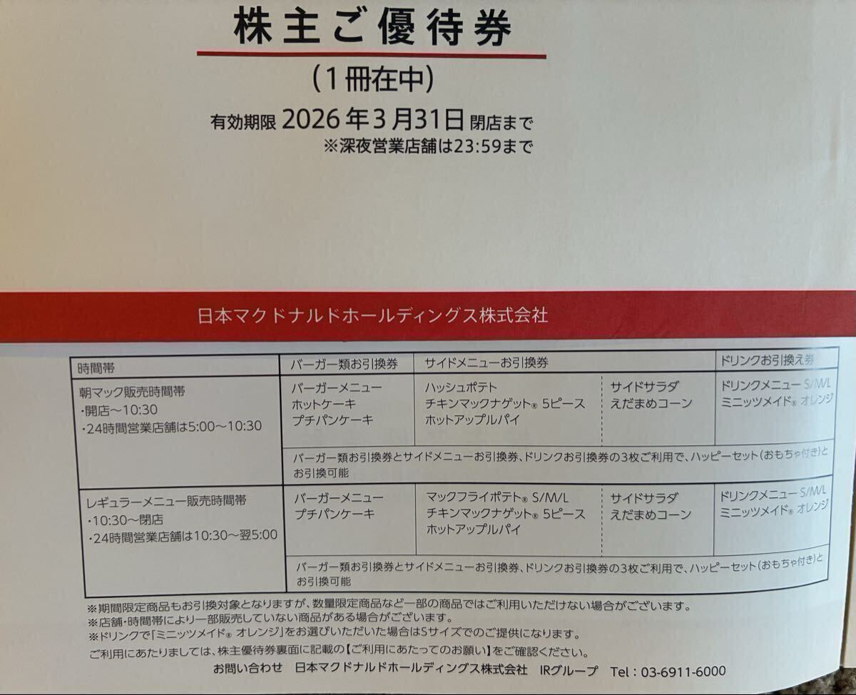 日本マクドナルドホールディングス株式会社 株主ご優待券1冊(6枚綴り)です。| 出价者 | 信用 | 价格 | 时间 |