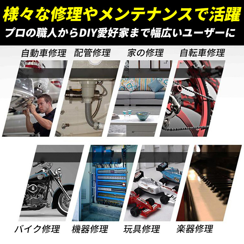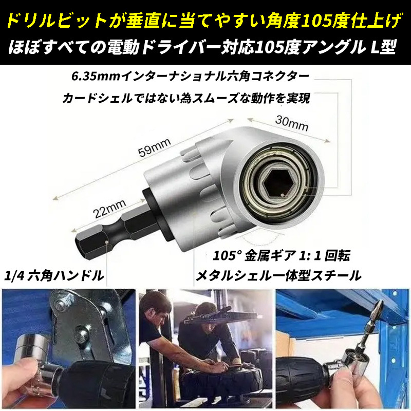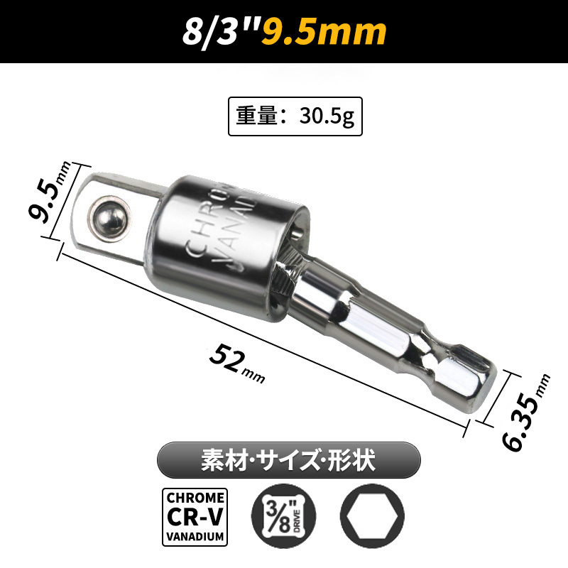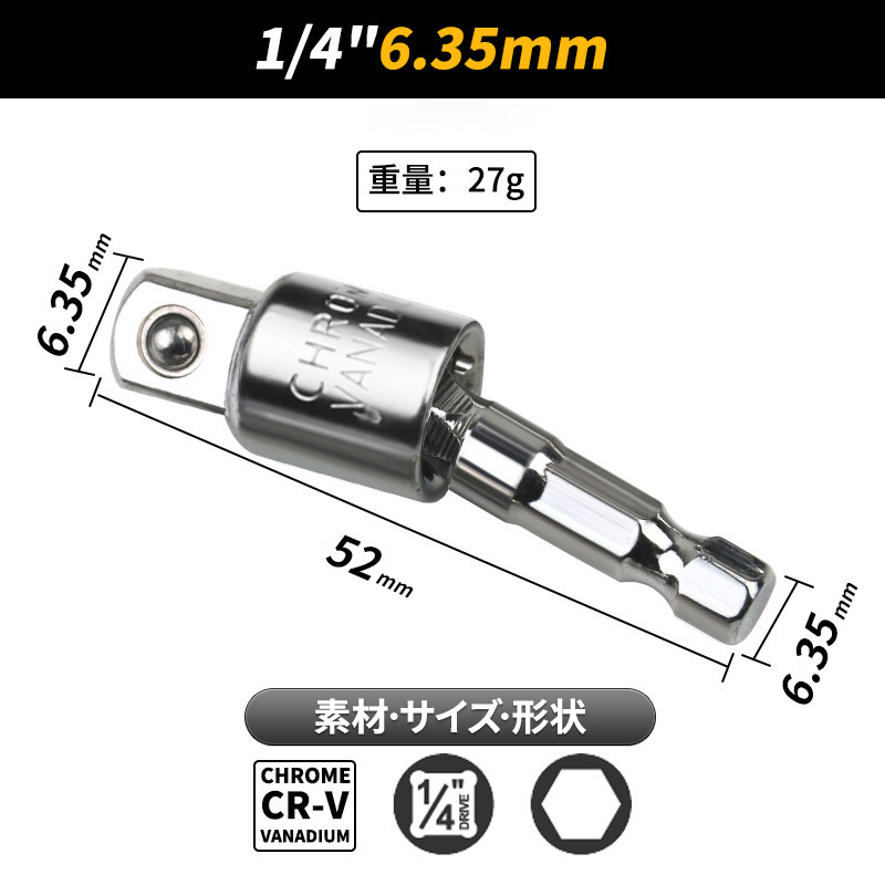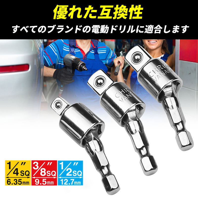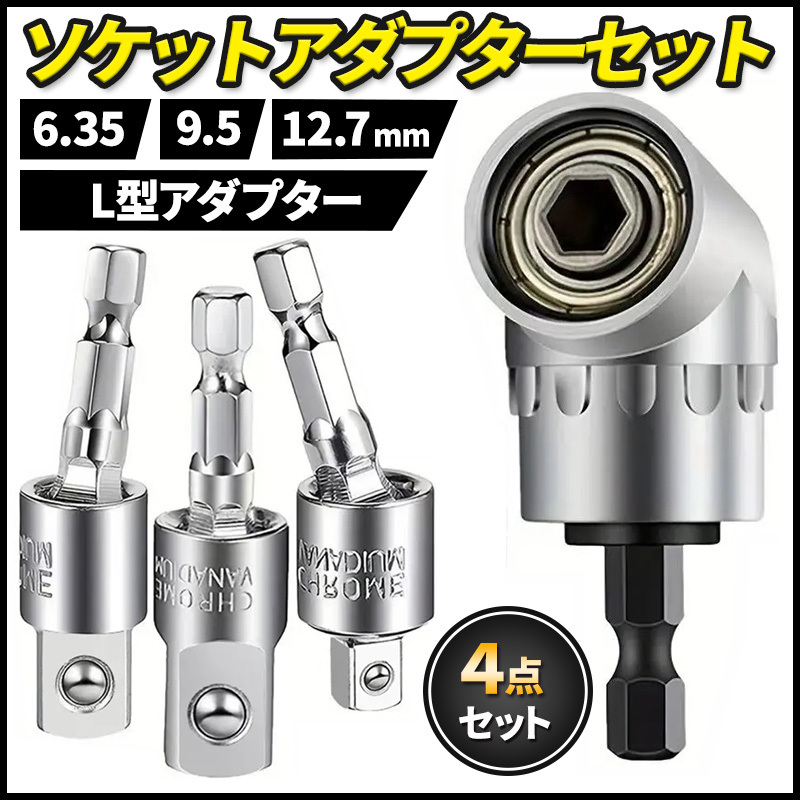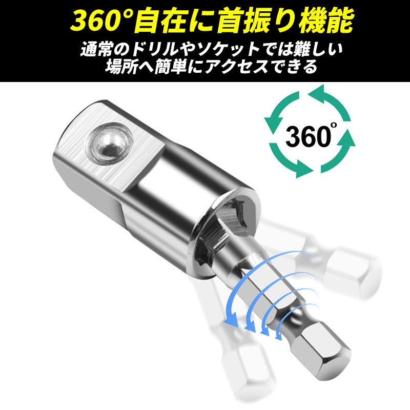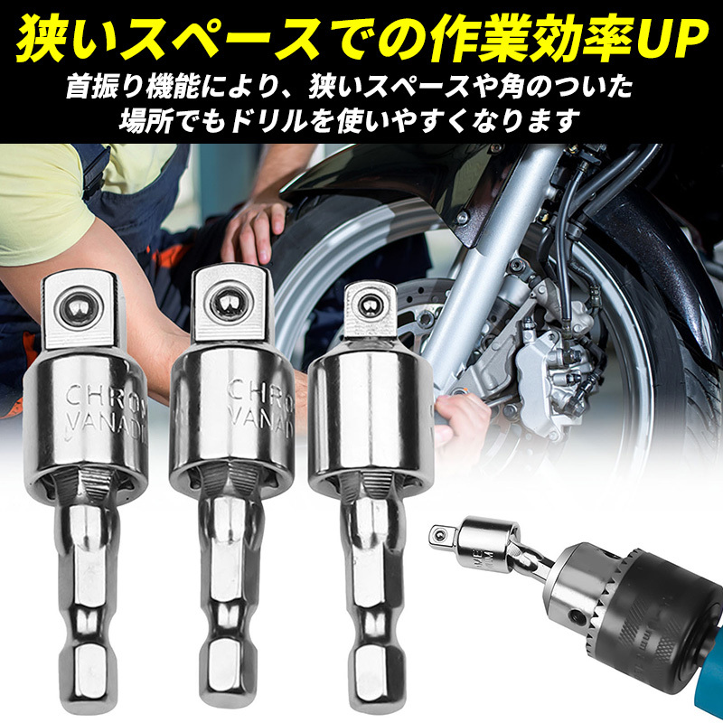 この首振りソケットアダプターセットは、電動ドリルと組み合わせて さらなる利便性と作業効率を提供します。 さまざまなサイズのソケットアダプター (6.35mm、9.5mm、12.7mm)とL型アダプターの組み合わせは、 電動ドリルのパワーと多機能性を最大限に活用できます。 首振りソケットアダプター サイズ対応性 このアダプターセットは、3つの異なるサイズのソケットに対応しています。 具体的には6.35mm(1/4インチ)、9.5mm(3/8インチ)、12.7mm(1/2インチ) のソケットを取り付けることができます。 多目的ツール 約30度程度までの首振り、360度自由に回転できるので作業の 場所によって角度を調整できます。 これらのアダプターは、様々な作業条件に対応できる多目的ツール として設計されています。異なるサイズのソケットに切り替えることなく、 一つのセットで多くの作業をこなせます。 サイズごとの用途 6.35mmアダプター:細かい作業や狭いスペースでの使用に適しています。 9.5mmアダプター:一般的な作業に最適で、幅広い用途に使用できます。 12.7mmアダプター:大型の作業や高トルクの締め付け作業に適しています。 パワフルな作業 電動ドリルと組み合わせることでボルトの締め付けや緩め作業が迅速かつ 効率的に行えます。 高トルク作業にも対応可能です。 L型アダプター 多彩なアプリケーション L型アダプターはソケットとハンドルを90度に曲げることができ、 狭い場所や角度のある作業に最適です。またボルトやナットの 締め付け緩め作業にも適しています。 プロのメカニックやDIY愛好者向け これらのアダプターは、プロのメカニックやDIY愛好者にとって 不可欠なツールで、作業の幅広いニーズに応えるための 最適な選択肢です。 このアダプターセットは異なるサイズと機能を組み合わせて、 多くの作業状況で効率的に作業できるため、作業の効率性と 便益を向上させる理想的なツールセットです。 ●商品仕様 変換ソケットサイズ1/4(6.35mm) ×1 変換ソケットサイズ3/8(9.5mm) ×1 変換ソケットサイズ1/2(12.7mm) ×1 全長:約55mm,約57mm,約60mm L型アダプタ 105℃アングル(59mm) クロムバナジウム鋼製で耐久性抜群 ※あまり強い力を加えてご使用しないようご注意下さい。 破損のおそれがございます。 | |