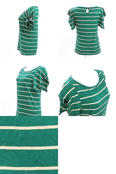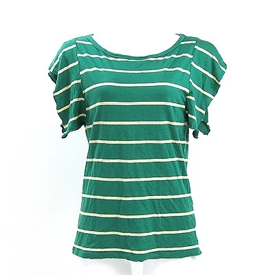 | カジュアルな装いに便利な一枚☆カットソーのご紹介♪ 鮮やかなグリーンに白地のボーダーがかわいいですよ。 フレンチスリーブのようになっているお袖もポイントです。 首周り・裾に毛羽立ちが、フロント部分に洗濯ばさみ跡が見られます。 お値打ち価格での出品になりますのでこの機会に是非どうぞ! 着丈約63㎝ 袖丈約10㎝ 肩幅約32㎝ バスト約86㎝ 【サイズ】:(F) 【素 材】:(レーヨン50%・指定外繊維(テンセル)30%・綿20%) 【 色 】:(グリーン) 【程 度】:(AB) 12120718-018 499 011 | ||||