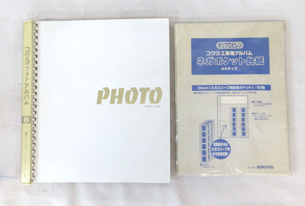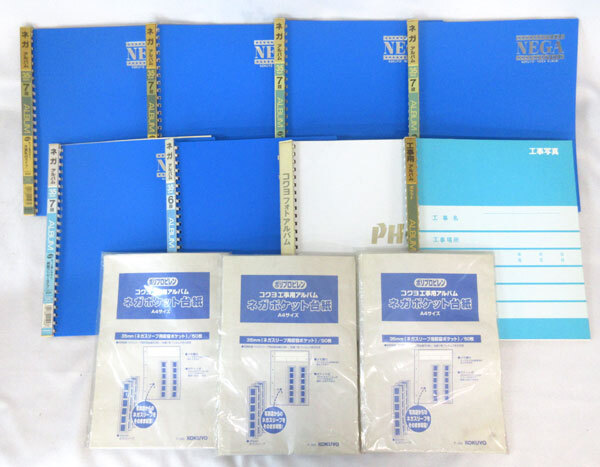 | 内 容 | ■コクヨ アルバム ・工事用アルバム ネガポケット台紙 A4(35mm/50枚)×3点 ・ネガアルバム 35mm 7段 両面クリアータイプ×3点 (外寸:約32.5×28.5×背幅2cm) ・フォトアルバム×1点 (外寸:約32.5×28.5×背幅2.5cm) ※台紙にシミ・汚れあり ・他×3種4点 ※商品にやけあります |