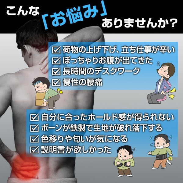数あるオークションの中から、アクセス頂きありがとうございます。 【日常が変わる!毎日が笑顔になるオリジナルベルトはあなたの元気を取り戻します!】 ・丈夫なメッシュ素材で通気性、耐久性抜群! ・こちらはXLサイズのご案内になります。(豊富な8サイズを展開!) サイズ:XLサイズ 横:全長約110cm(腰周り:約86~95cmまで対応) 幅:約20.5cm 材質:ポリエステル65%・コットン35% カラー:ブラック (サイズ表も合わせてご覧くださいませ) ・Wベルトとマジックテープでしっかりホールド&加圧! ・医療用特殊樹脂ボーン採用だから驚きの軽さで、しっかりサポート! ・ボーンの本数が調節可能な為、ご自身の体調やご 使用環境に応じてホールド感の調整が可能です! 【こんな方にオススメです】 長時間のデスクワーク、立ち仕事、ヘルニアやぎっくり腰、 関節痛などの不安がある方、日常的に腰のサポートをしたい、 ウエストのシェイプアップなど、幅広く様々な方にご利用いただけます。 【特徴】 ・二段式ベルトの長さ、ボーンの間を日本人体型にリサイズしました。 ・ボーンが最大5本内蔵でき自由に取り出せるので5→4本など数を変えて 体調やご使用環境に応じてお使いになれます。 ・丈夫なメッシュ素材を採用しているので、通気性はもちろん耐久性にも優れています。 ・洗濯機で洗えるのでお手入れが楽! 【特典もついてくる】 ・オリジナル収納ポーチが付属! ・購入者だけの特典漫画で解説日本語説明書付き! ・100%安全保証!サイズ交換ももちろんOKです。 ※3Dボーンを装着しての激しい動きには向いておりません。ご注意願います。