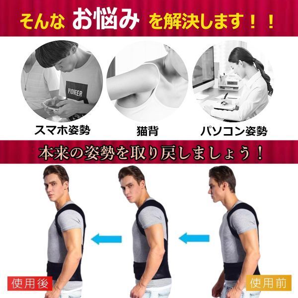 こんなお悩みはございませんか? スマホ利用などで巻き肩になっている。 気がつくと猫背姿勢になっている。 長時間同じ姿勢でいることがある。 首や肩こりがあり疲れやすい。 テレワークで腰や骨盤が痛い。 【美しい姿勢へ】 長時間のデスクワークやパソコン・スマホの使い過ぎで、身体の歪みが気になってる方へ。 そんな悩みを解消し美しい姿勢を保つために開発された姿勢矯正サポーター! 正しい姿勢を自然と意識することで、肩を開いて姿勢をサポートします。 【優れたサポート力】 ・本体背面に固定ボーン2本が内蔵することで正しい姿勢へと導きます。 ・たすき掛け構造のため、軽い力で背中全体をアポートします。 ・上部がY字構造になっているため滑らかに肩のラインにフィットします。 【通気性抜群】 全体にメッシュ素材を使っていますので、通気性が向上。 【こんな方にオススメ】 長時間のデスクワーク、スマホ操作、読書、ゲーム、長距離ドライバーなどのような方におすすめです。 長時間の同じ姿勢や、間違った姿勢にならないように、着用するだけでサポートしてくれます。 美しい姿勢を習慣化して理想の美しい姿勢を保ちましょう。 【豊富なサイズ展開】 S、M、L、XL、XXLの6サイズ展開。 ご自身にピッタリのベルトをお選び頂けます。