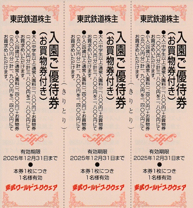 | ●東武ワールドスクウェア ご優待割引券です。 ●有効期限は2025年12月31日までです。 ●入札価格は割引券3枚の価格です。 ●お支払金額は、落札価格+送料になります。 | ||