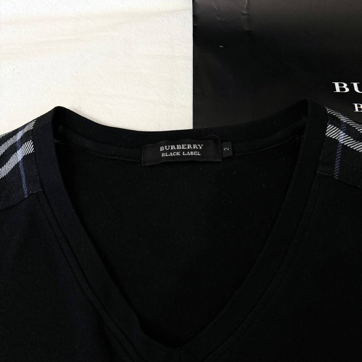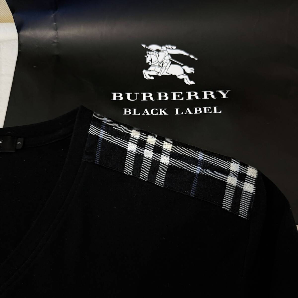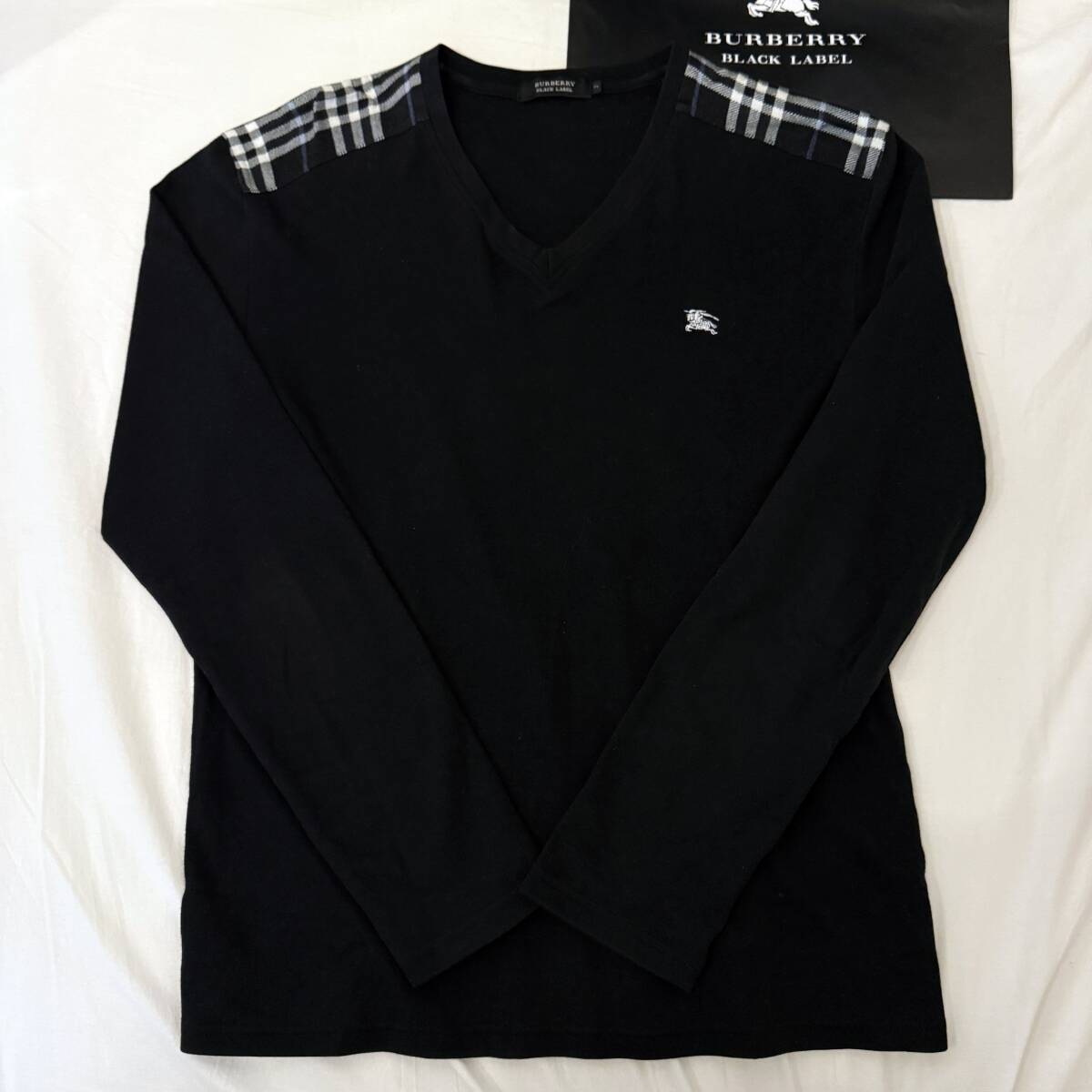 | 美品 名作 BURBERRY BLACK LABEL バーバリーブラックレーベル 長袖VネックTシャツ ロンT 肩ノバチェック ホース刺繍 黒 2(M) #3221 | |