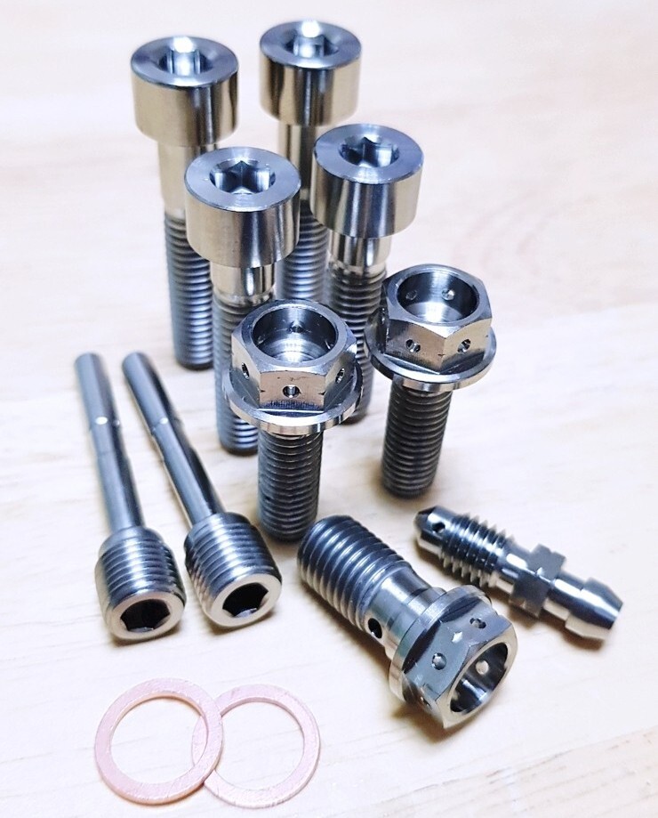 バンジョーボルトとブリーダースクリューは、私が出品している40-A番と44-A番の説明を参照してください。 チタンボルトは、従来の純正ボルトに比べて半分の重さです。