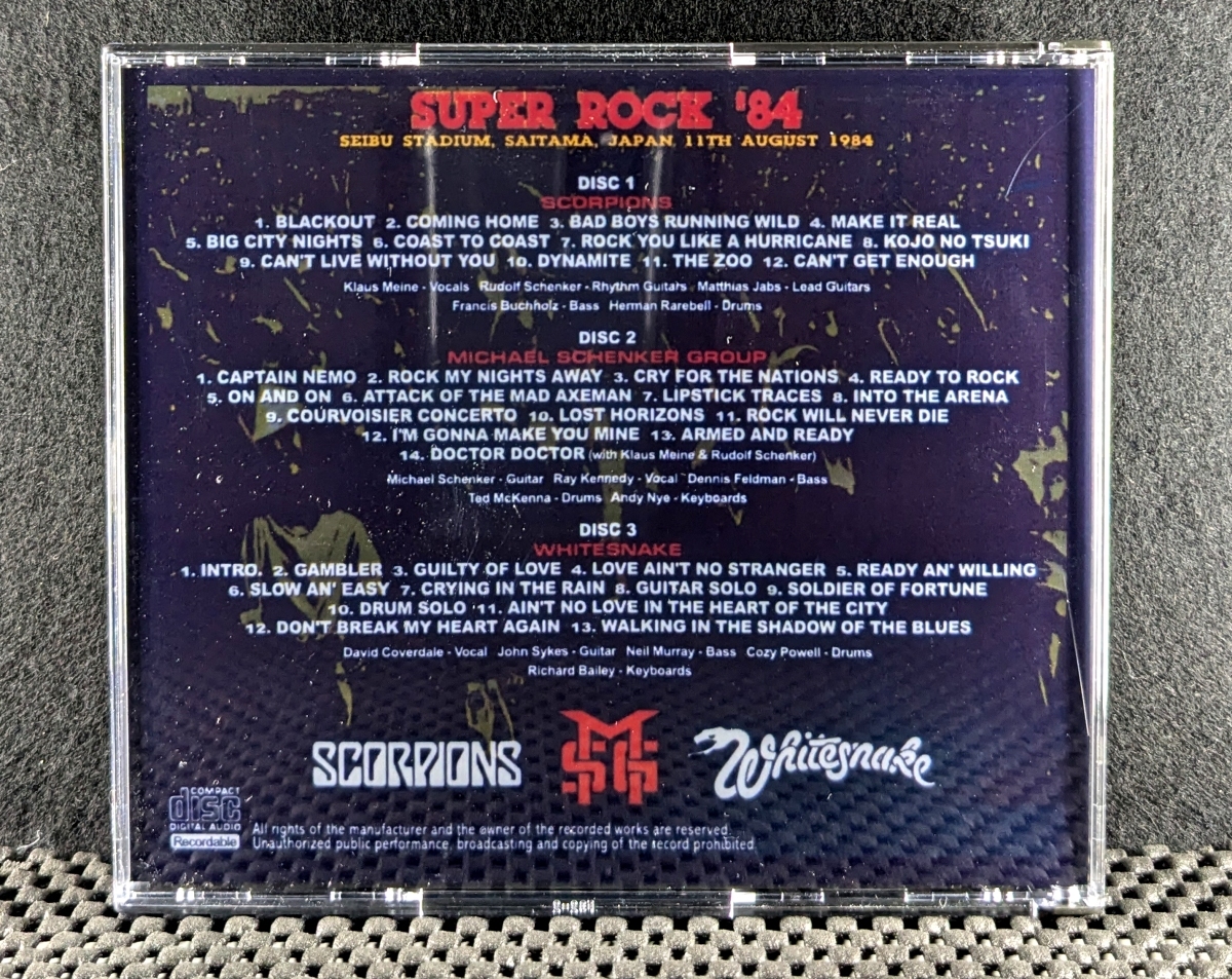 1984年8月11日「スーパーロック '84」西武球場初日公演より、スコーピオンズ、マイケル・シェンカー・グループ、そしてこの日トリを務めたホワイトスネイクのライブを、いずれもコンプリートしてここに。それぞれ聴き応え抜群のステージをたっぷりとお楽しみ頂ける歴史的アイテム!