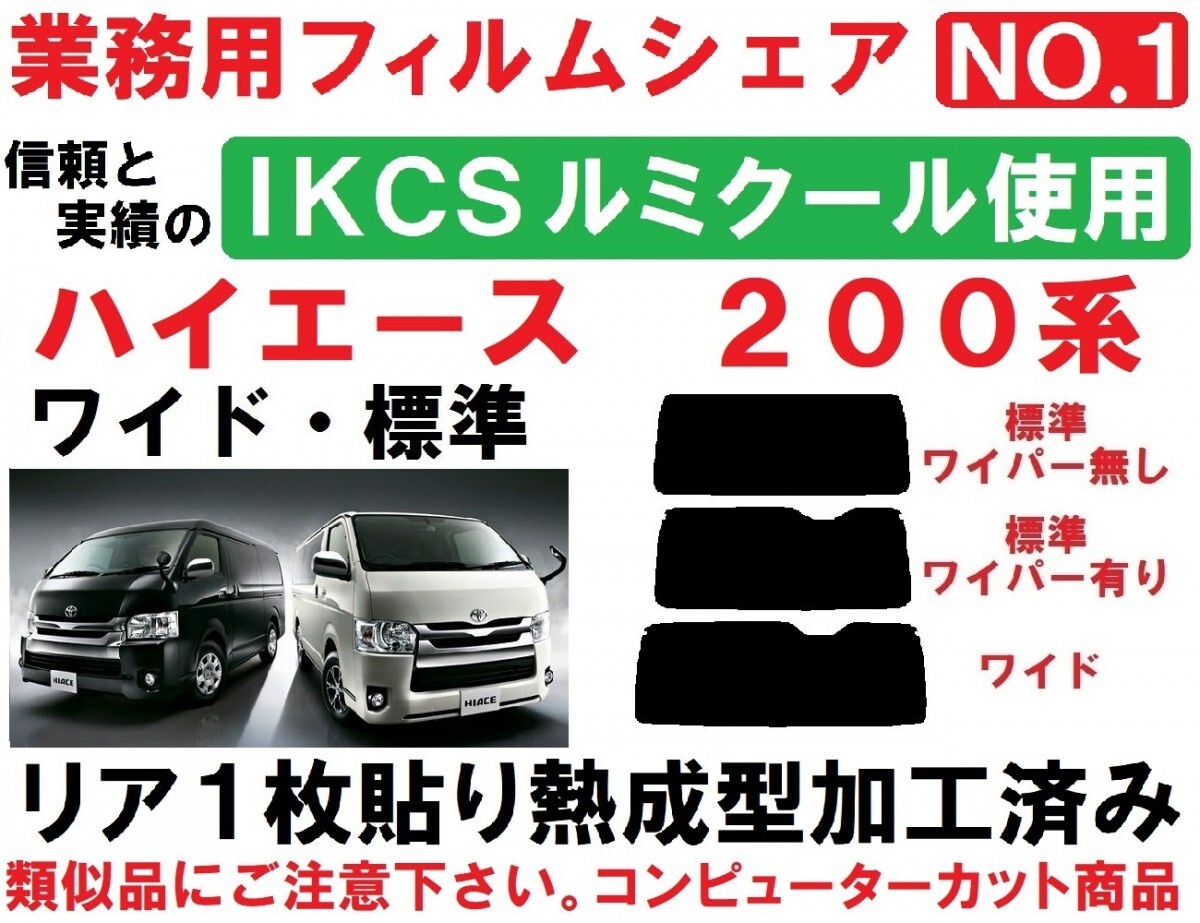 | 200系ハイエース/レジアスエース、標準ボディ~ワイドボディ用『IKCSルミクール使用』1枚貼り成型加工済みフィルム リア1面です。(専用施工液付き) ・信頼の品質と実績で永い間業務用フィルムとして選ばれ続けているIKCS製品です。 ・業務用フィルムの中で最も信頼性の高い、ベストセラー商品です。 ・詳しくはアイケーシーエス株式会社HPをご覧ください。 ※『ルミクール』は当店でも 施工実績・販売実績NO.1の超人気商品です。 平成16年~令和7年のマイナーチェンジ後まで、200系ハイエース・レジアスエース(標準ボディ・ワイドボディ)各種対応出来ます。 ※適合等 ご不明な点など有りましたら、お気軽にご質問下さい。 ◇◆◇精密コンピューターカット◇◆◇ 貼りやすさを最優先に各部のサイズ・形状など微調整し、改良を重ねた独自のデータを製作。 高精度な最新・大型カッティングプロッターによるカットで正確で滑らかなカットラインを再現しています。 施工業者だからわかる、貼りやすいサイズ・形状に仕上げています。 ◇◆◇リア1枚貼り成型加工済み◇◆◇ リアガラスの湾曲に合わせて熱成型加工して有りますので、平面に貼るのと同様にたるみが出ず1枚貼り出来ます。 ※最適な状態に成型加工して有りますので、ヒートガン(ドライヤー)等は不要です。 ◇◆◇標準ボディ・ワイドボディ対応◇◆◇ 標準ボディ・ワイドボディ リアワイパーの有無 年式 グレードなどにより、ガラスの種類が複数有るため 落札後お車の詳細をお聞きし、適合する商品をご用意させて頂きます。 ◇◆◇専用施工液付属◇◆◇ 軽視されがちな施工液ですが、貼りやすさに大きく関わる部分になります。中性洗剤などで代用せず、必ず付属の専用施工液をご使用下さい。 濃度については車種・季節などにより変わりますので、個別にお知らせ致します。 国内シェアNO.1の『IKCSルミクール』を使用しています。 ルミクールは経年退色が極めて少ない着色加工技術はもちろん、安定した冷暖房効率をアップする熱線遮断効果や断熱効果、内装を守り日焼けを防ぐため、全てのフィルムで99%の紫外線カットを実現しています。 ガラスの飛散防止効果で高い安全性を保ち、ハードコートタイプなのでキズにも強いカーフィルムです。 信頼の品質と性能で、永い間業務用フィルムとして選ばれ続けています。 ■フィルムの種類■ 可視光線透過率 3% NS-003HC 可視光線透過率 7% NS-008HC 可視光線透過率13% NS-015HC 可視光線透過率20% NS-020HC 可視光線透過率30% NS-030HC 可視光線透過率46% NS-045HC ■全商品、キズに強いハードコート・紫外線(UV)99%カットです。 ※可視光線透過率が低くなるほどフィルムの色は濃くなります。 当商品はリア1面になります。 他にもハイエース用フィルム各種出品中です。 ご不明な点など有りましたら、お気軽にご質問下さい。 主な適合型式:TRH200K、TRH200V、KDH200K、KDH200V、KDH201K、KDH201V、KDH205K、KDH205V、KDH206K、KDH206VTRH211K、TRH214W、TRH216K、TRH219W、KDH211K、TRH211K、TRH214W、TRH216K、TRH219W、KDH211K GDH201V GDH206V GDH201K GDH211K GDH216K | ||