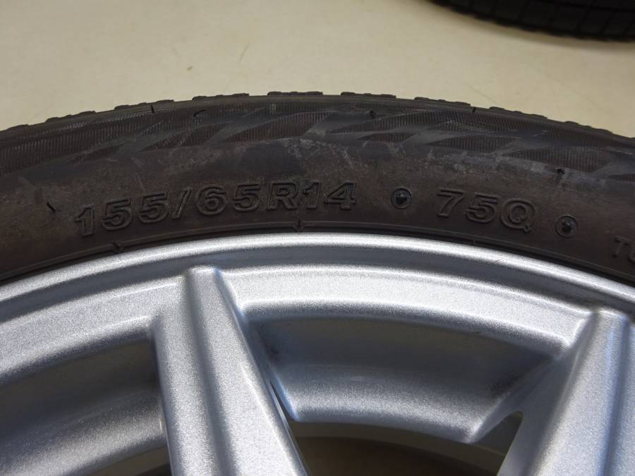 ホイールの設定 4.5J オフセット+45 PCD100 4穴 ハブ径 約67mm ※状態ですが多少傷がございます。 タイヤ BS (ブリヂストン) BLIZZAK VRX2 サイズ 155/65R14 75Q 4本 タイヤの溝 2本、 約 9.5分山 2本、 約 9分山 製造年数 4本、 2021年式 ※人気商品、比較的程度良好! (個人差はございますので写真で判断宜しくお願い致します。) | ||||