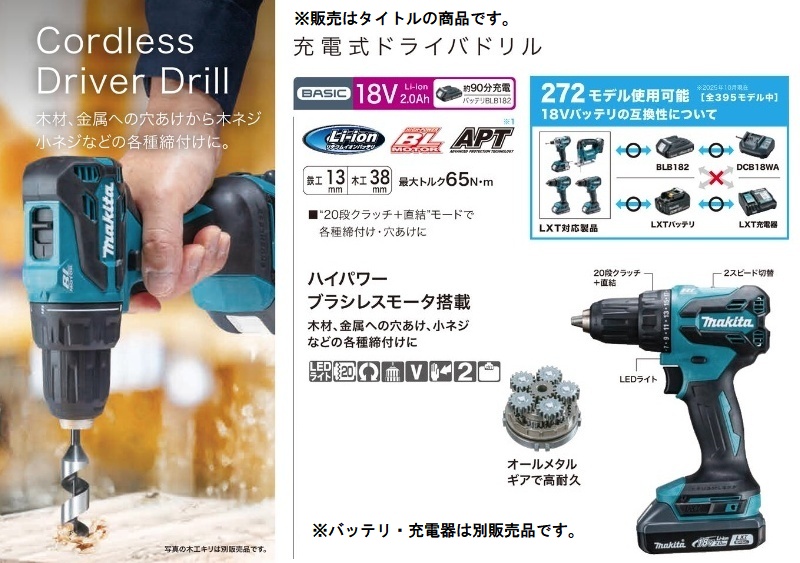 DF490DBをバラしたオリジナル商品です。マキタ makita充電式ドライバドリルDF490DZK 本体+ケース付きです。※バッテリ・充電器は別販売品です。■最大トルク65N・m■『20段クラッチ+直結』モードで各種締付け・穴あけに■ハイパワーブラシレスモータ搭載■木材、金属への穴あけ、小ネジなどの各種締付けに■オールメタルギアで高耐久※別販売品のリチウムイオンバッテリBL1860B(0088381464031)使用可能です。1970500098520197050009852