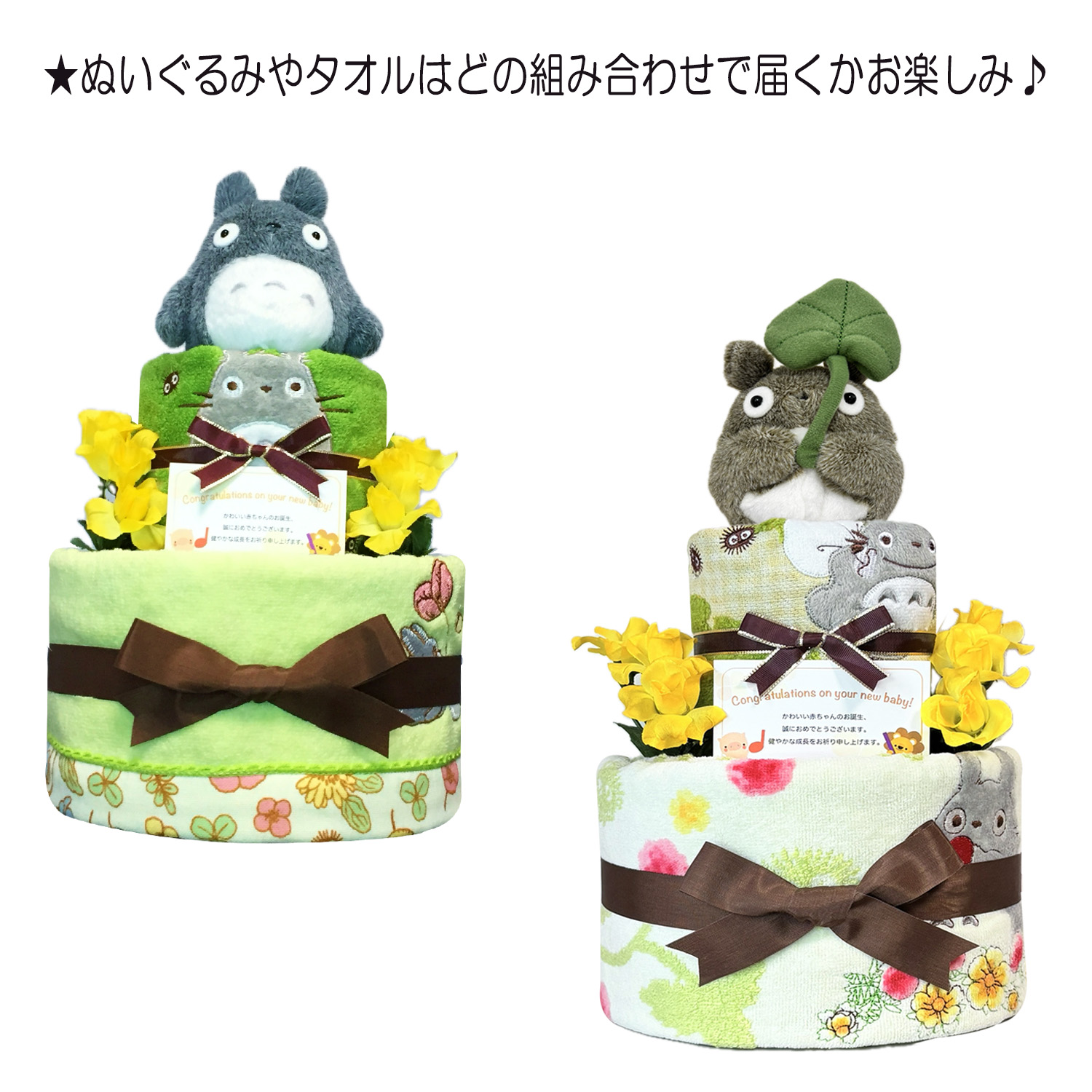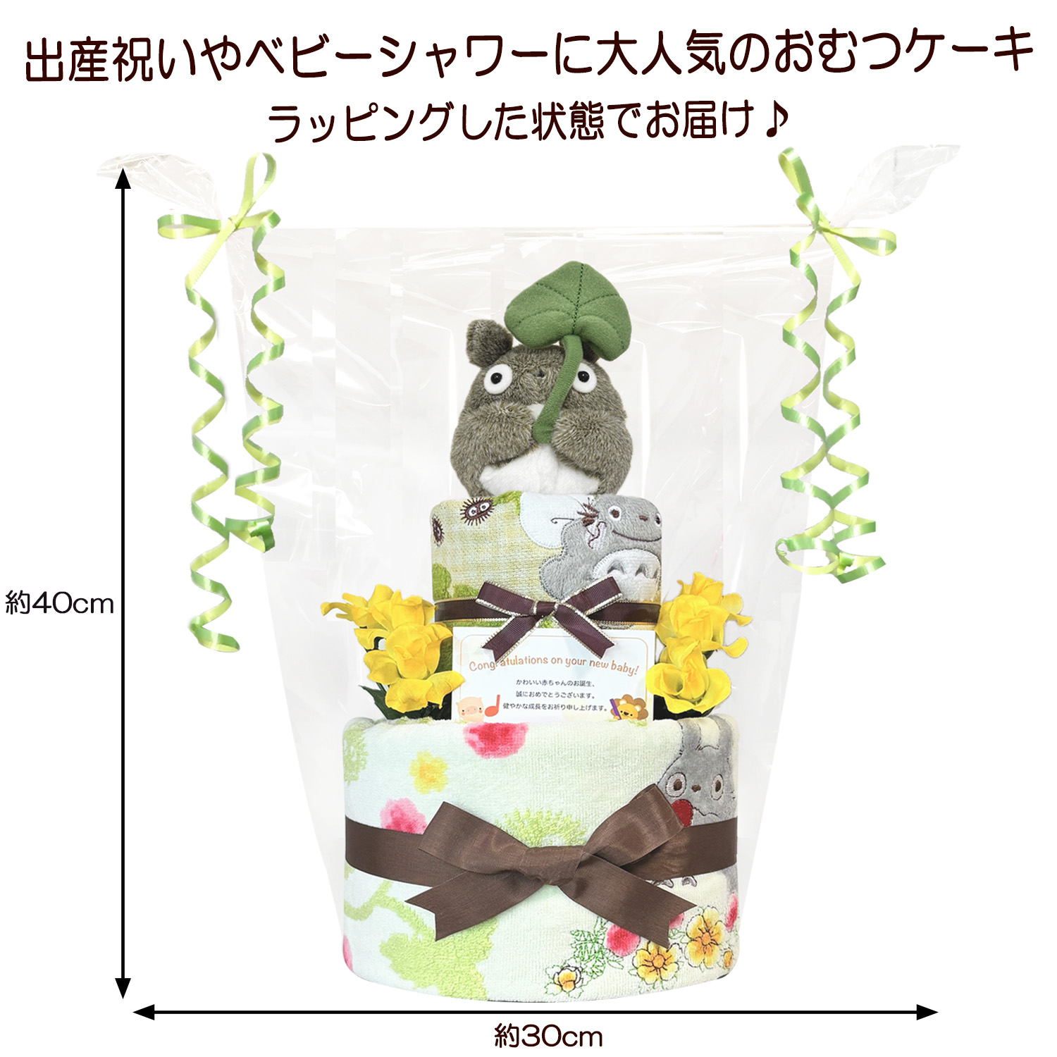 子供達に大人気のとなりのトトロのタオルやぬいぐるみなどをセットに、1つ1つ丁寧に手作りされたおむつケーキのギフトです♪ 大人気のトトロとパンパースの組み合わせで豪華なおむつケーキになっております。出産祝いやお誕生日プレゼントに大変喜ばれるギフトです。 ギフト用にラッピングを施し、可愛いギフトボックスにお入れしてお送りいたします。 おむつケーキに使われているおむつはお届け先の赤ちゃんやお母様にも安心していただける様に、衛生面にも考慮し、手を洗った後に手袋を着用し、1枚1枚個別包装してありますので、ホコリや湿気をしかっりガードいたします。 そのままお出かけにも持ち運べます。 ご購入していただいたお客様に満足して頂くことはもちろん、贈り先の赤ちゃんやお母さん、お父さんの幸せを願ってお作りいたしております。 |
